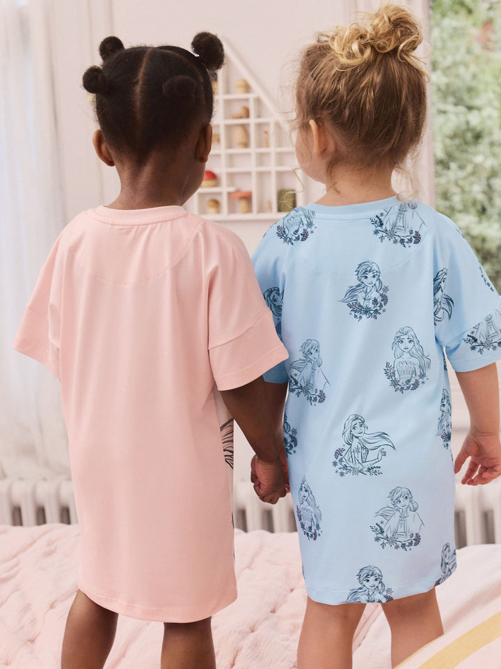 Perfect for you little princess, this 2 pack of Frozen nighties will ensure a comfy slumber. In a lightweight fabric with short sleeves, each one is adorned in a fun Anna and Elsa print with glitter detailing. 2 pack Lightweight fabric Short sleeves Frozen glitter prints Machine washable. 2 x Nightdress 95% Recycled polyester, 5% Elastane. Country of Origin: China Warning: Keep away from fire and flames.