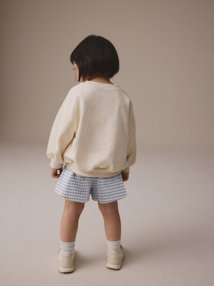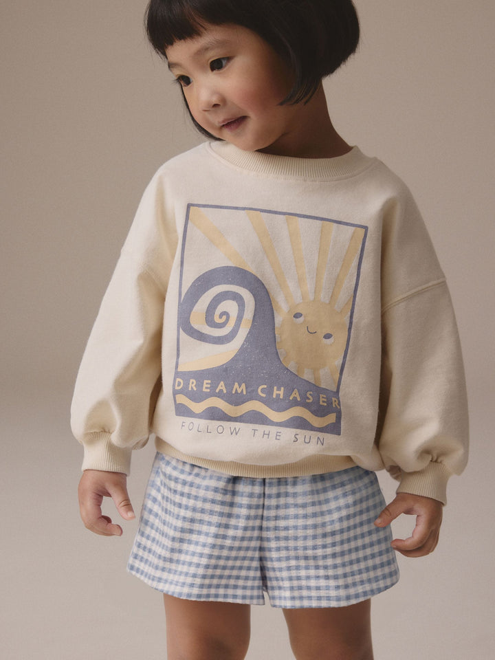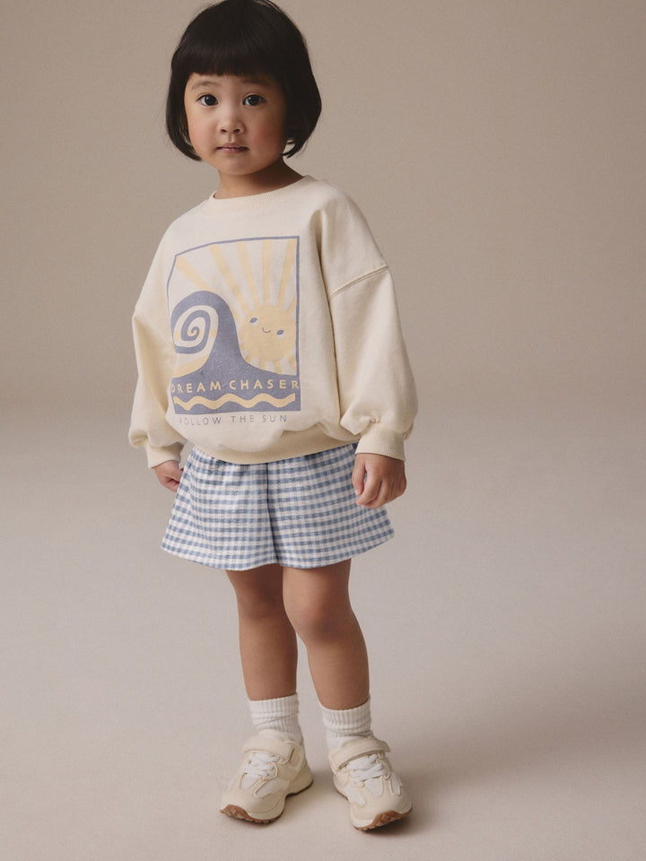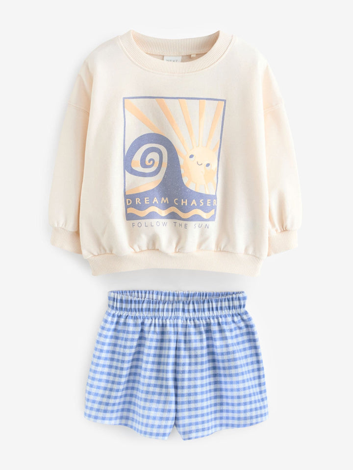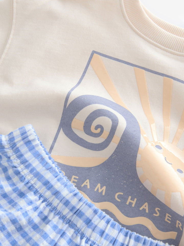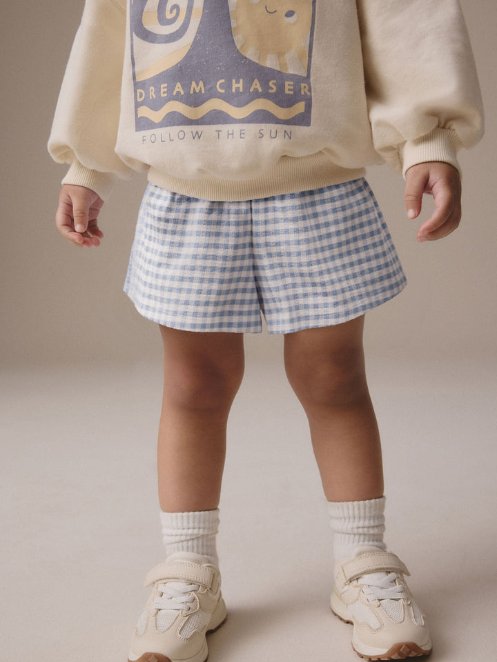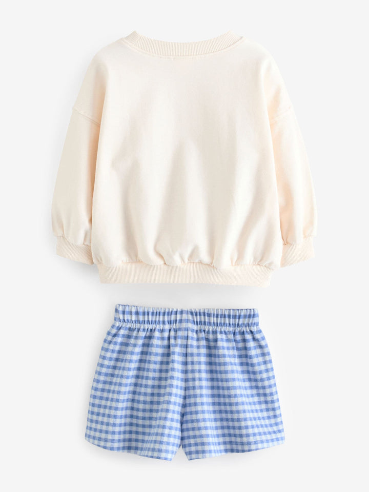 Effortlessly cool, our blue gingham top and shorts set makes a fun addition to her wardrobe. Featuring a long sleeve printed top and gingham shorts both crafted from pure cotton, this set is perfect for summer styling. 2 piece set Long sleeve top Graphic print design Gingham print shorts Elasticated waistband Machine washable. Sweater and Shorts 100% Cotton. Country of Origin: Bangladesh