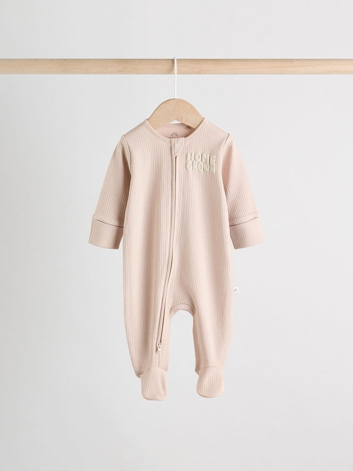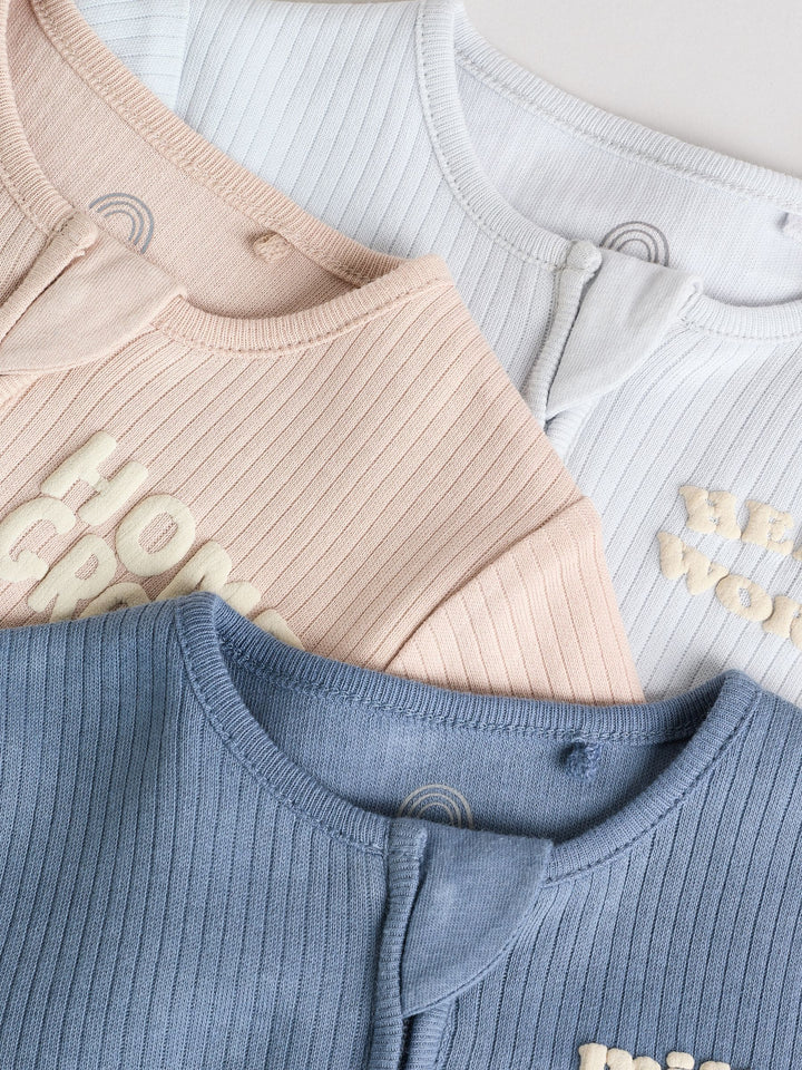 Our 3 pack of baby sleepsuits are ideal for stocking up on essenitals. Made from pure cotton, each piece is long sleeve and rib texure. The two way zip fastening makes for easy dressing with a fun slogan design on the front and back. 3 pack 100% cotton Long sleeve Slogan design Two way zip fastening Machine washable. 3 x Sleepsuit 100% Cotton. Country of Origin: India Warning: Keep away from fire and flames.