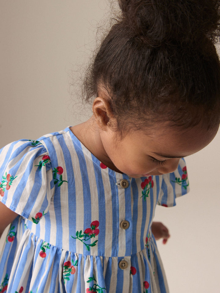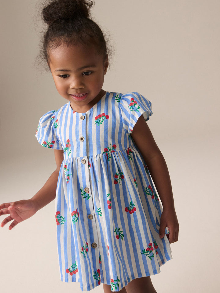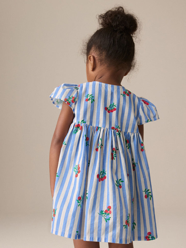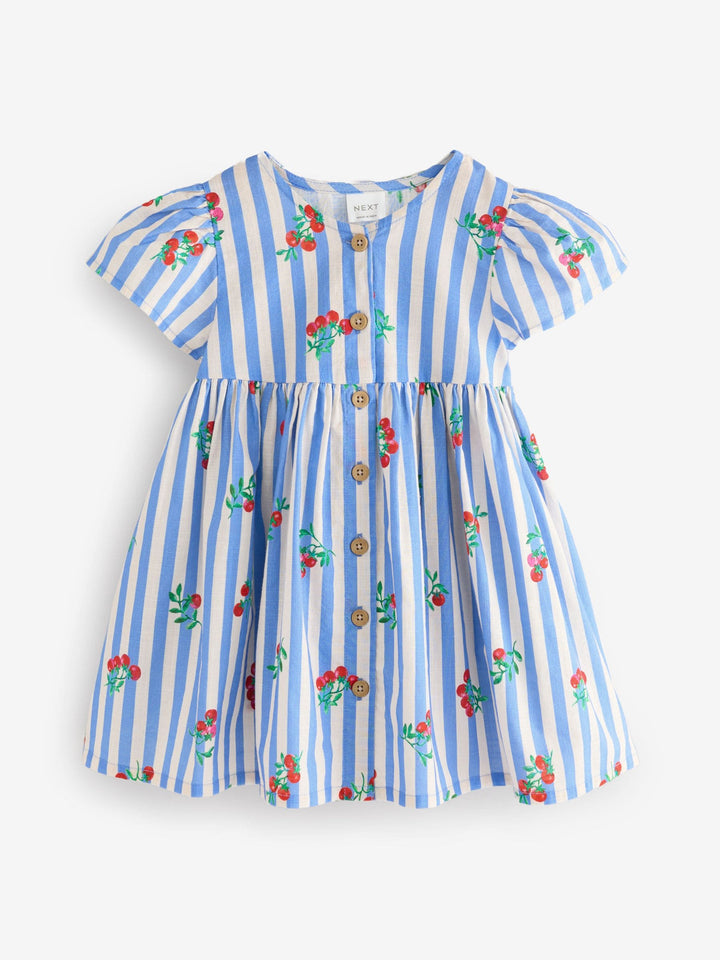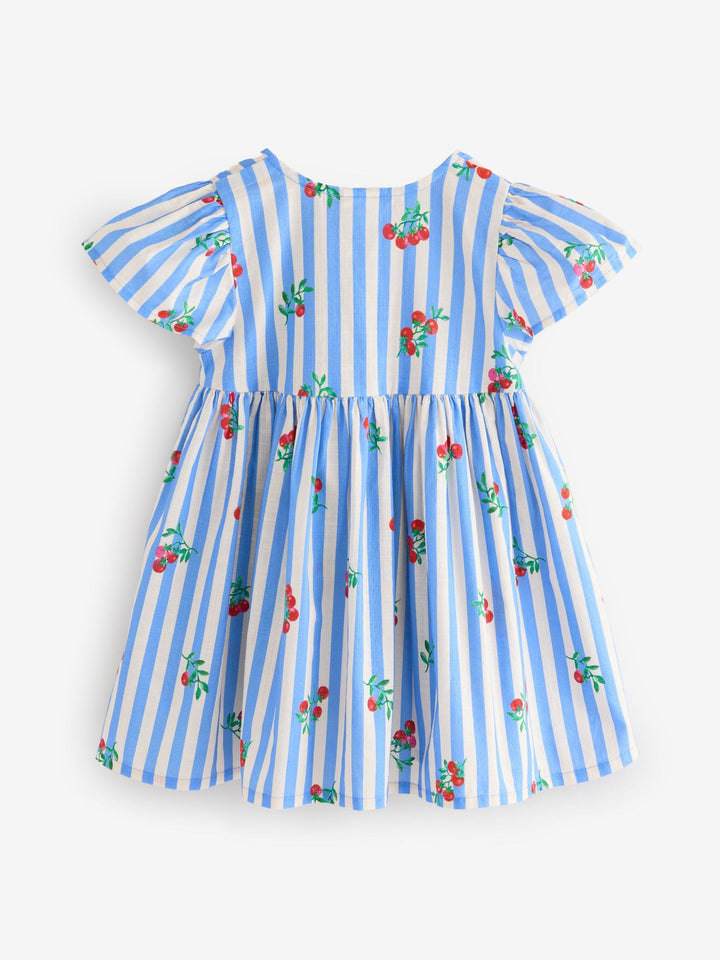 This pretty button-up dress is made from pure cotton in a cherry print and striped design, with cute angel sleeves and a round collar. Perfect for parties or everyday wear. 100% cotton Angel sleeves Button-up fastening Round collar 100% Cotton. Country of Origin: India