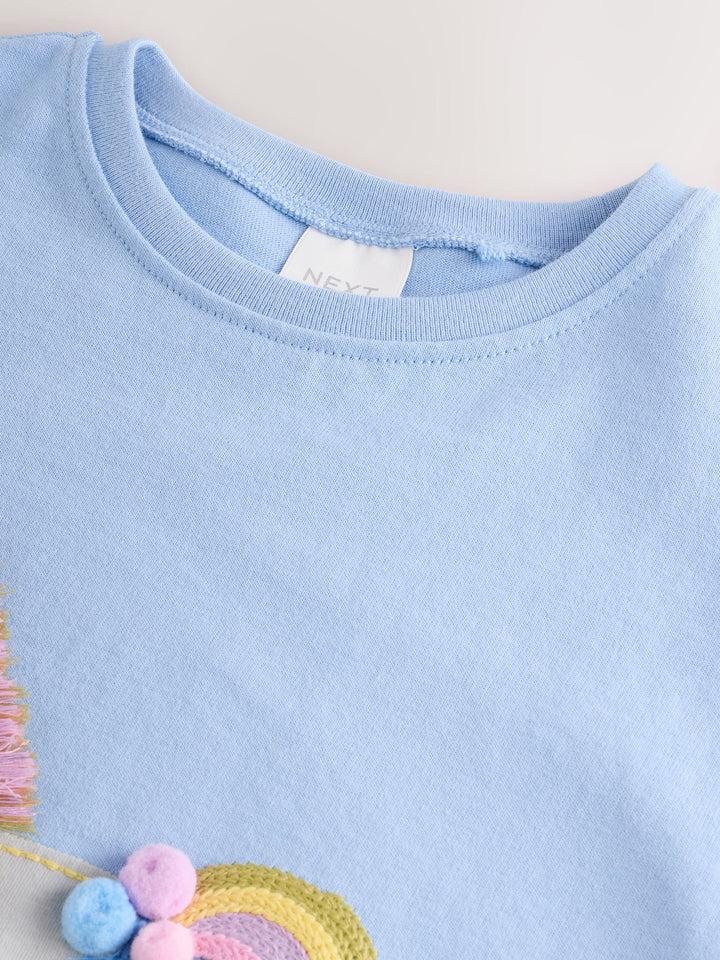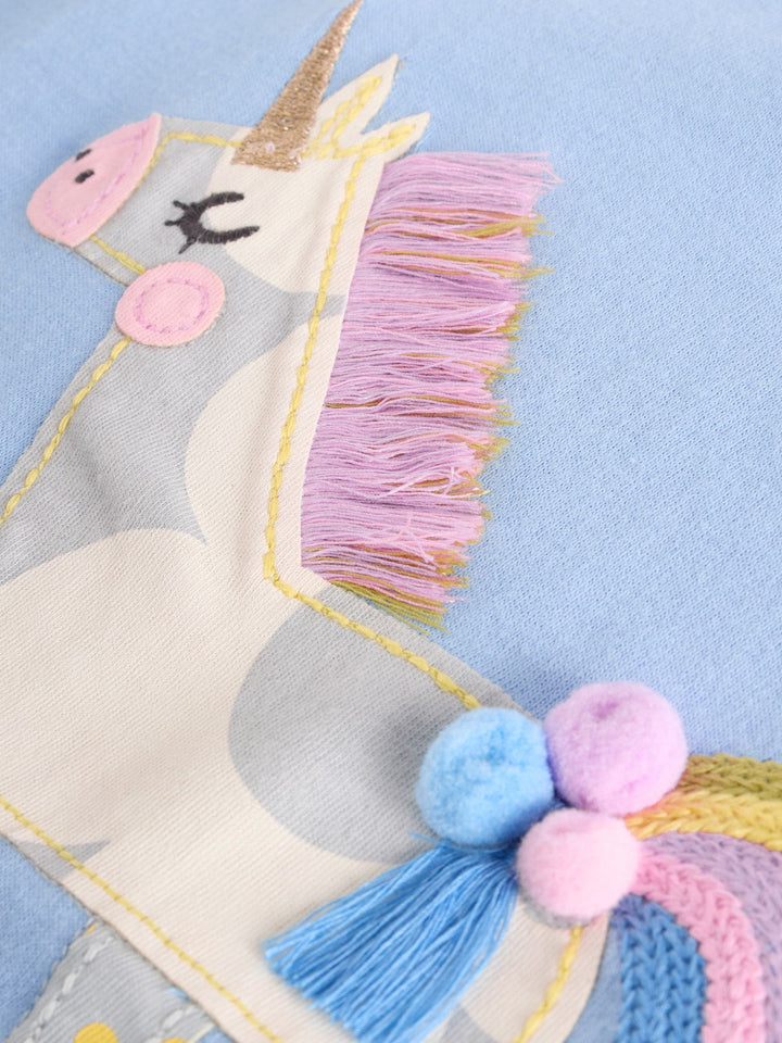 This pure-cotton t-shirt features a light blue hue with a stitched unicorn chest applique graphic, featuring fringe trim and pom-pom detailing, finished with a crewneck collar. 100% cotton Unicorn chest applique Fringe and pom-pom detailing Crewneck collar Machine washable. 100% Cotton. Country of Origin: Sri Lanka