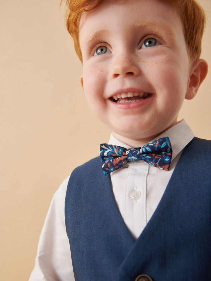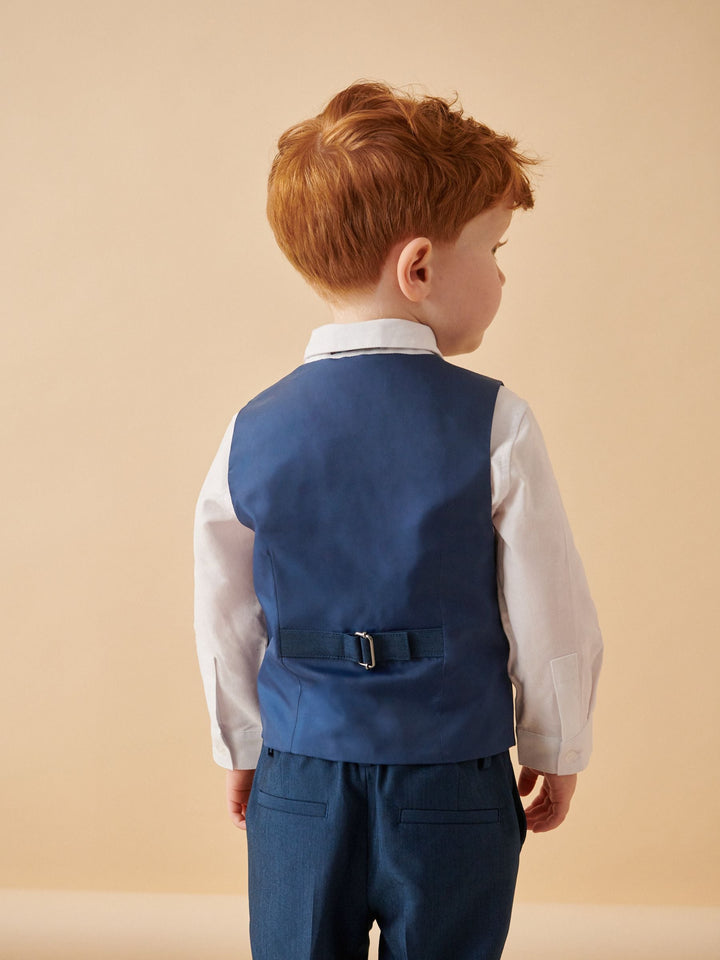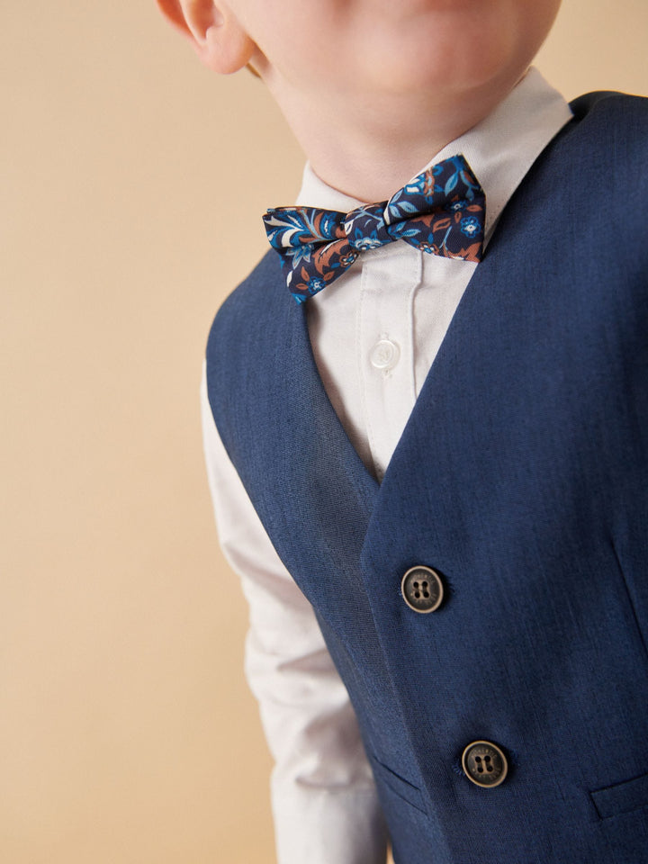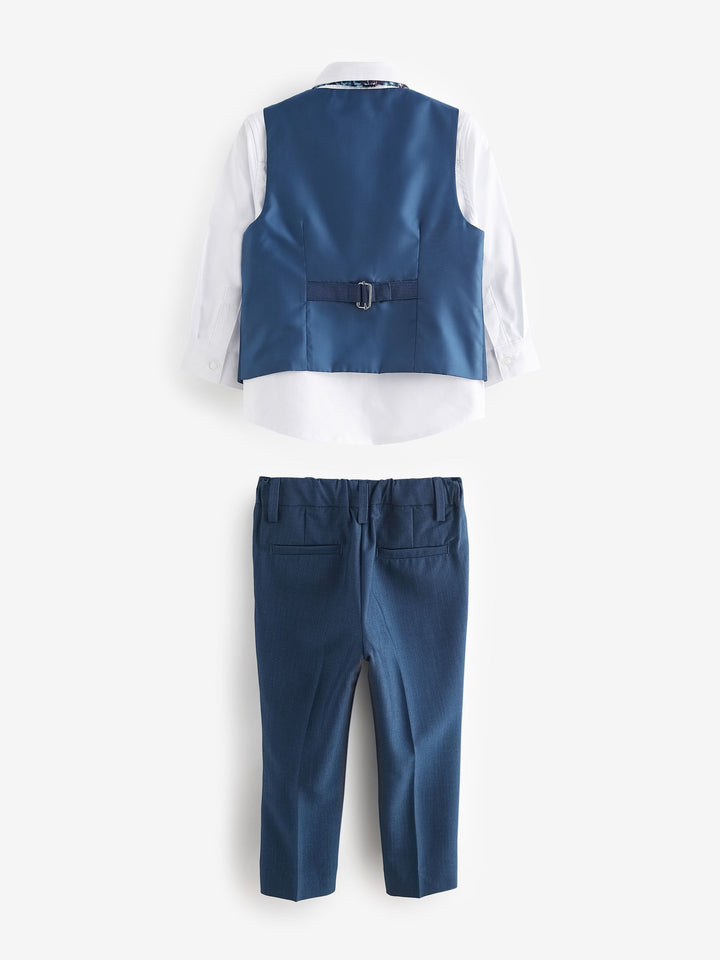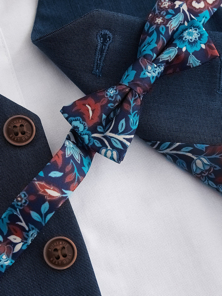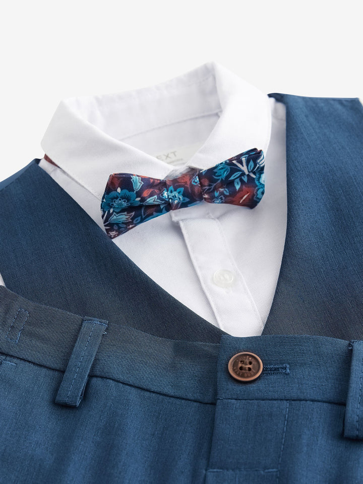 Featuring a blue waistcoat, shirt, trousers and bow tie, this set ensures he looks smart, stylish and cute as a button. Designed with a classic long sleeve button-up shirt, a printed bowtie, blue trousers and matching waistcoat with a three-button fastening and patch pockets. 4 piece set. 100% cotton shirt. Trousers and matching waistcoat. Patterned bow tie. Waistcoat Main 69% Polyester, 25% Viscose, 6% Elastane. Lining 100% Polyester. Shirt 100% Cotton. Trouser 69% Polyester, 25% Viscose, 6% Elastane. Bow Tie 100% Polyester. Country of Origin: Cambodia