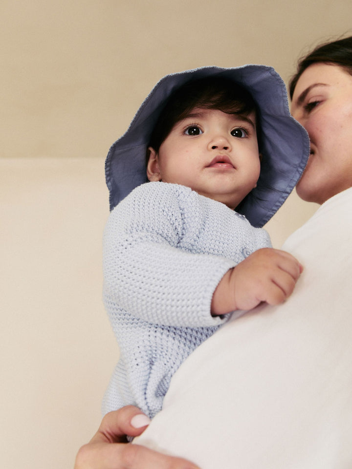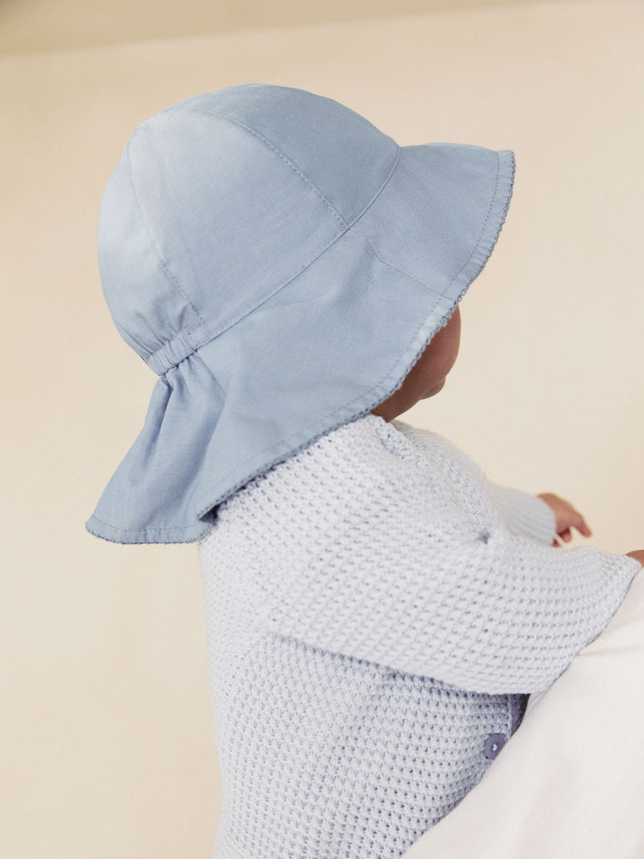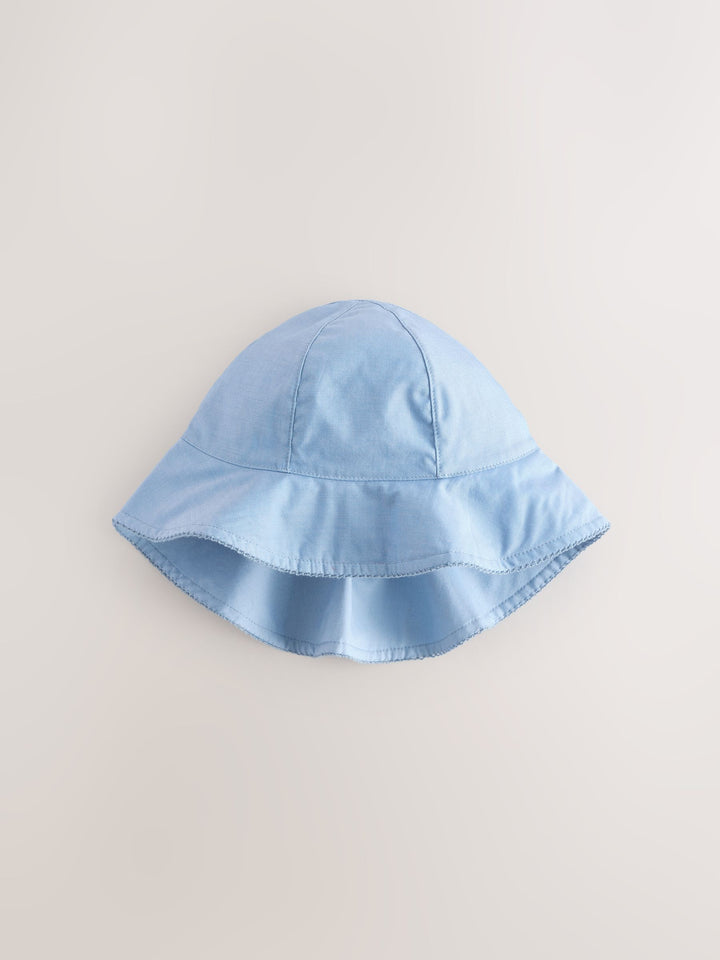 Keep her head protected with our 2 pack of blue and white chambray hats. Crafted from pure cotton, each hat has a wide brim for added coverage and is elasticated for a snug fit. 2 pack 100% cotton Wide brim Elasticated 2 x Hat Main 100% Cotton. Lining 100% Cotton. Country of Origin: China Warning: Keep away from fire and flames.