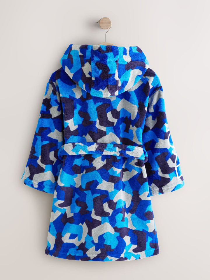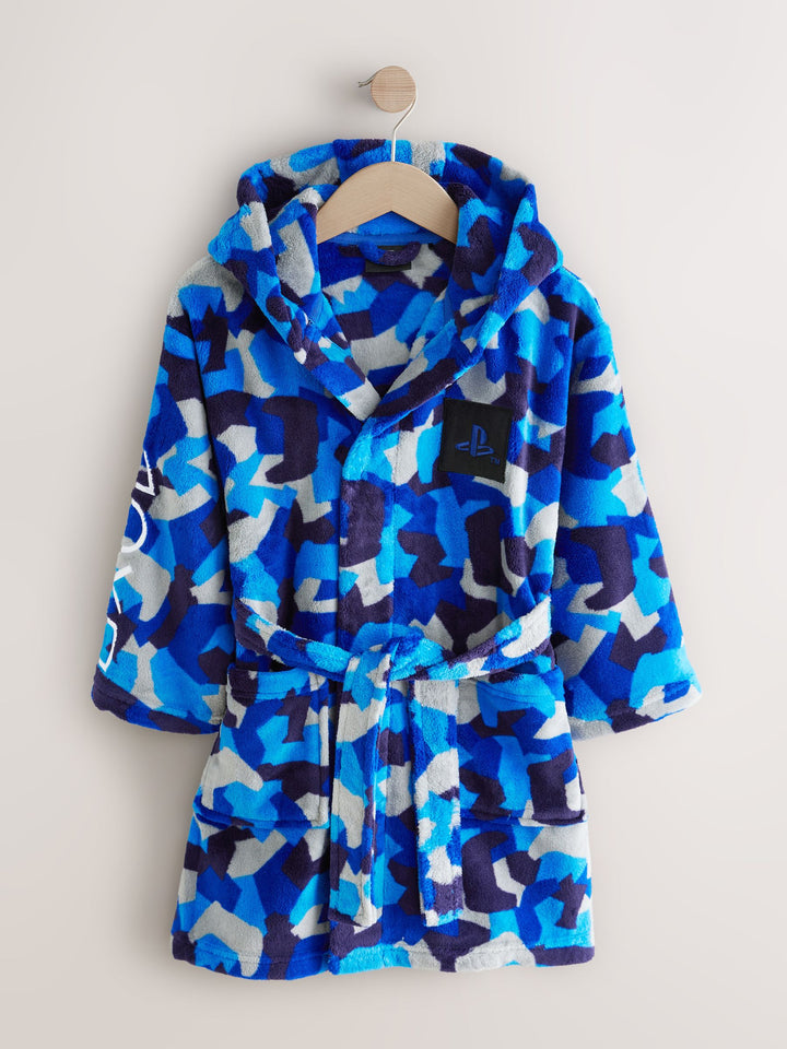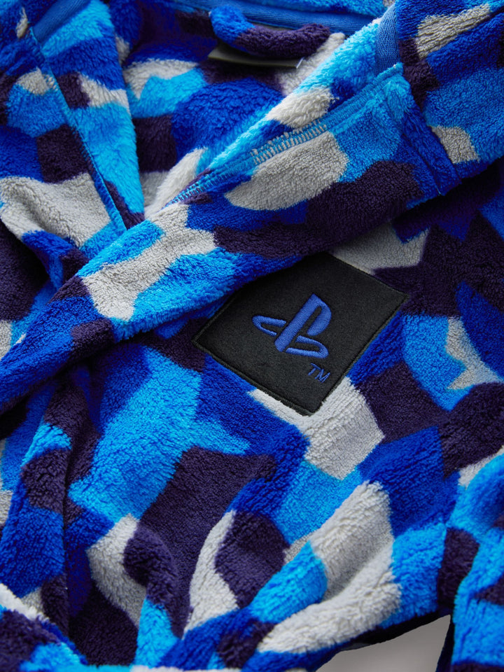 Playstation gamers rejoice. This comfortable robe is made from a soft fleece fabric, featuring Playstation graphics to the chest and sleeve, an all-over camo print and an adjustable tie waist, finished with a hood. Fleece fabric Playstation graphics Set-in hood Tie waist fastening Machine washable. 75% Recycled polyester, 25% Polyester. Country of Origin: China Warning: Keep away from fire and flames.