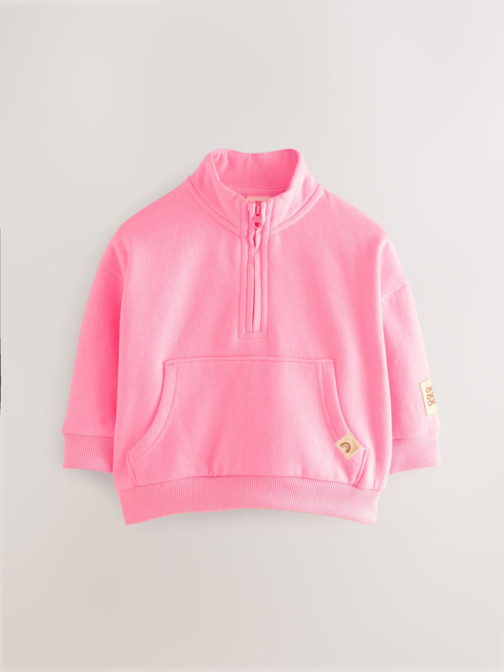 In a fluro pink cotton-rich blend, this classic half-zip sweatshirt will keep her cosy when layered over her favourite casual t-shirts or dresses, featuring drop shoulders, a kangaroo pocket, a tall collar and ribbed trims. Cotton-rich blend Half-zip fastening Tall collar Kangaroo pocket Drop shoulders Ribbed hems Machine washable. 65% Recycled polyester, 35% Cotton. Country of Origin: Pakistan