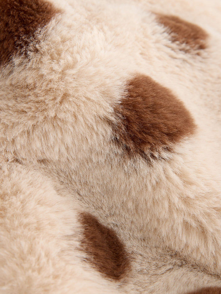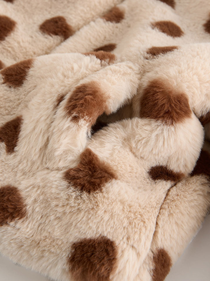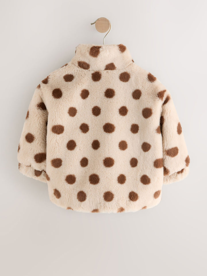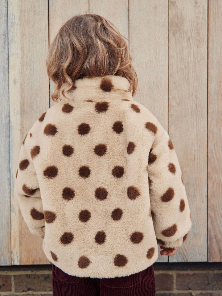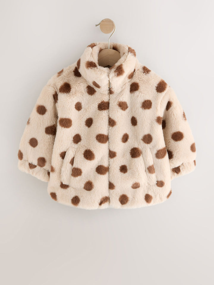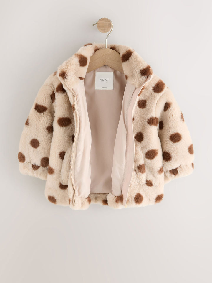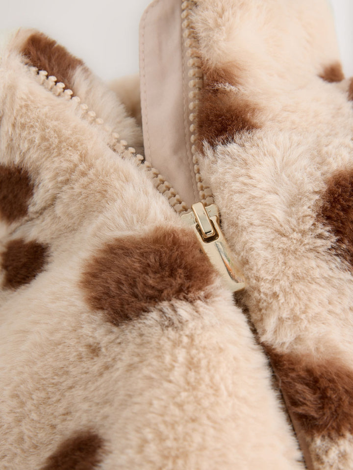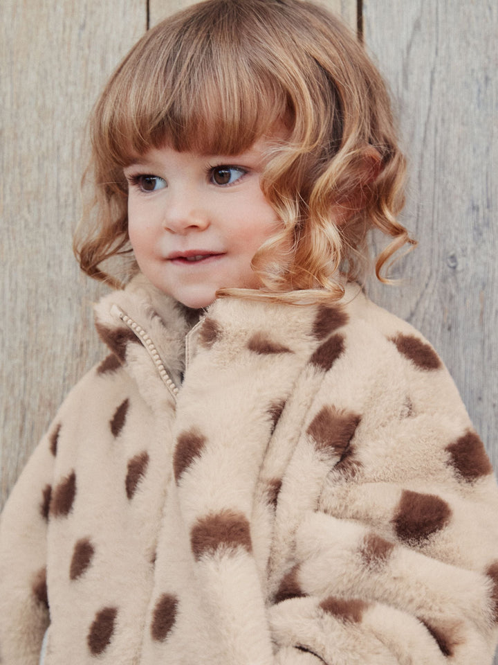 Add a playful touch to their outerwear with this Cream-brown spot print bomber jacket. The soft faux fur and all-over spot print create a fun and fashionable look, while the cosy full lining provides warmth on cooler days. With a classic bomber shape and a zip-up fastening, it's a stylish and comfortable choice for their outdoor adventures. Faux fur printed outer Fully lined Zip-up fastening Bomber jacket style Ribbed cuffs and hem Machine washable. Main 100% Polyester. Lining 100% Recycled polyester. Country of Origin: China