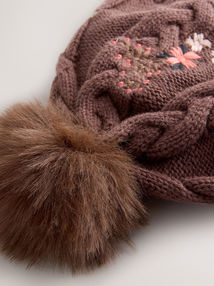 Brown Floral Embroidered Pom Baby Beanie Hat (0mths-2yrs)