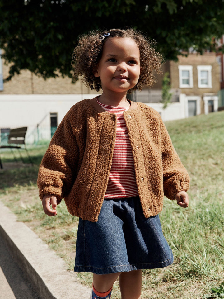 Cosy and adorable, this fleece bomber jacket is a perfect layer for autumn. The soft and snug borg fabric and jersey lining provide all-day comfort, while the cute design adds a fun touch. A great piece for keeping warm on cooler days. Borg fleece Jersey lining Cute design Snap fastening Main 100% Recycled polyester. Lining 100% Cotton. Embroidery 71% Acrylic, 29% Polyester. Country of Origin: China