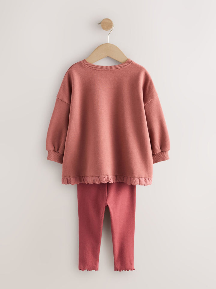Dress her in playful charm with this sweet frill hem sweatshirt and leggings set, perfect for comfortable casual wear and everyday fun. This two piece set is made from cosy brushed jersey fabric and features a charming broderie hem detail on the top. Two piece set Cosy brushed jersey fabric Features broderie hem detail and 3D bow Includes flared leggings Ideal for casual wear Machine washable. Sweater 85% Cotton, 15% Recycled polyester. Leggings 94% Cotton, 6% Elastane. Country of Origin: Sri Lanka