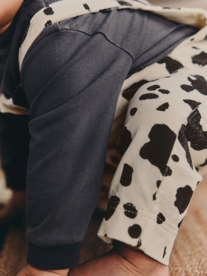 Dress your little one in this adorable 2 piece charcoal and cream cow set, perfect for playtime adventures. The soft cord dungarees feature a fun cow print and a button front with easy popper opening legs. This is paired with a long-sleeved peached fabric bodysuit that includes nickel-free poppers at the crotch for quick changes. Soft cord fabrication dungaree in cow print Long sleeve peached fabric bodysuit Button front with popper opening legs Poppers at crotch No harmful chemicals or dyes Nickel-free poppers 2 piece set Machine washable. Dungaree Main 100% Cotton. Lining 100% Cotton. Bodysuit 95% Cotton, 5% Elastane. Country of Origin: Sri Lanka Warning: Keep away from fire and flames.
