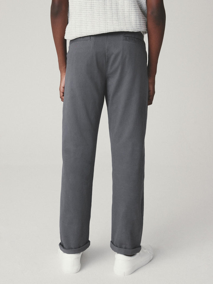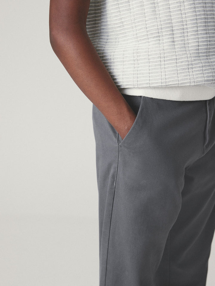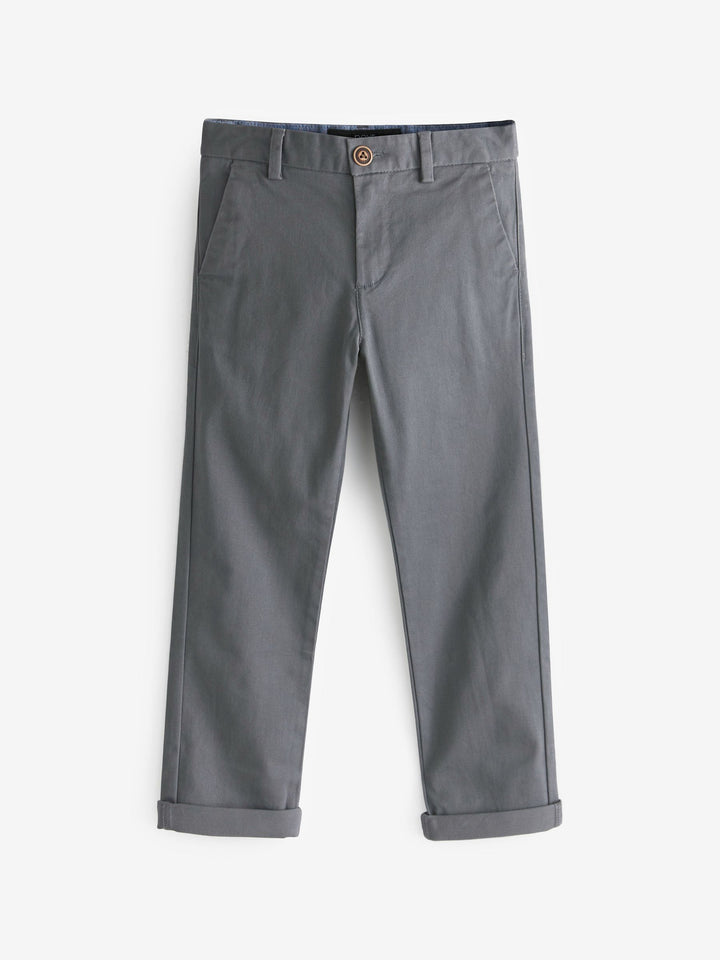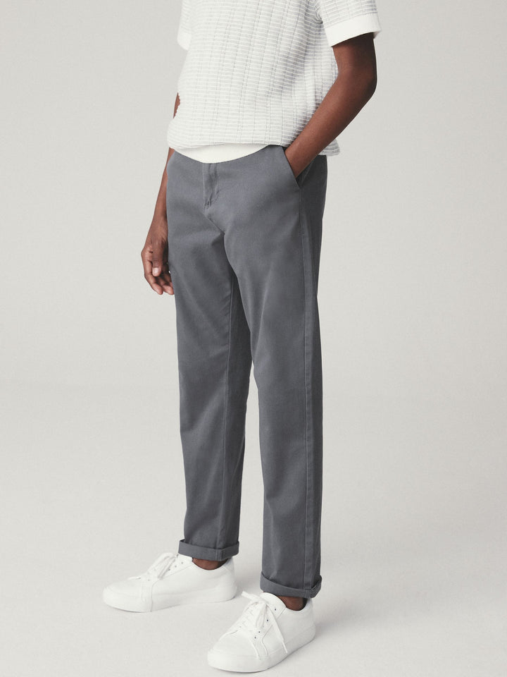 Our chino trousers in charcoal grey are made for the young style set. With a comfortable stretch in their stride, these trousers lend a cool, relaxed vibe with a neat and tidy finish. Perfect for any occasion, pair them with a crisp shirt or go casual with a graphic T-shirt. The adjustable waist ensures a perfect fit. 98% Cotton, 2% Elastane. Country of Origin: Bangladesh