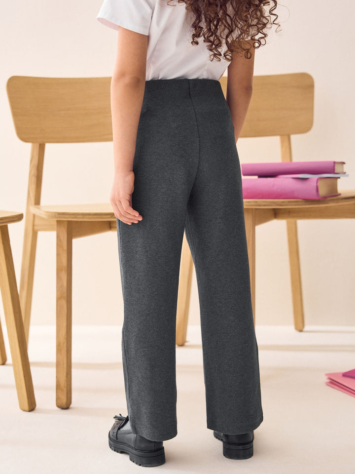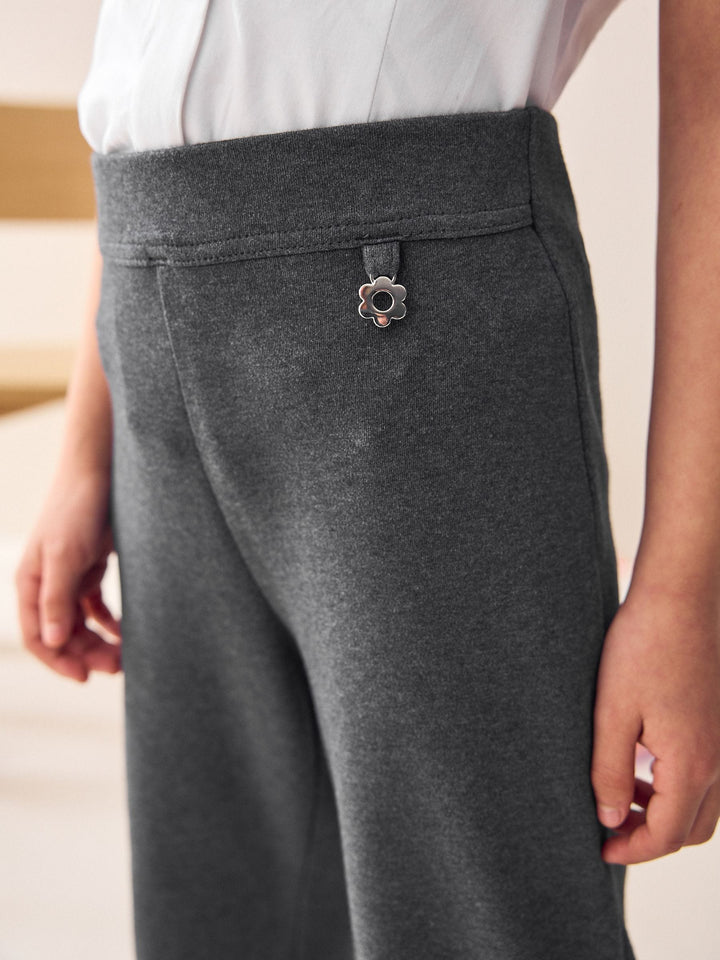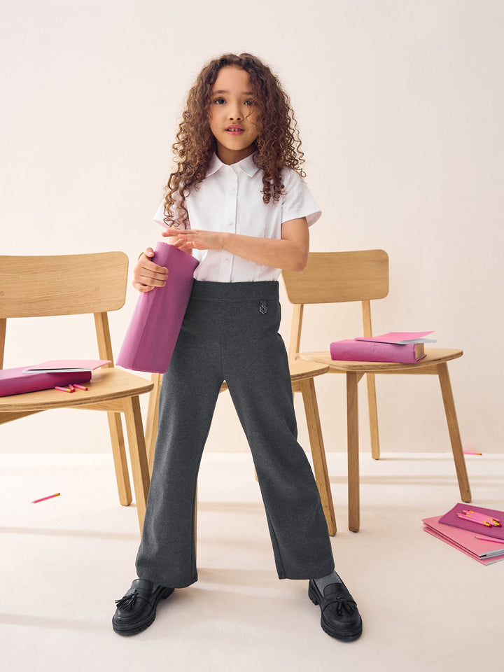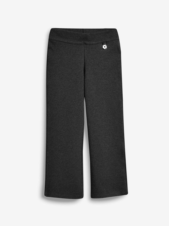 These smart charcoal grey school trousers feature a trendy bootcut-style leg with a comfortable cotton-blend fabric with added stretch, finished with a pull-on elasticated waistband to take the fuss out of getting ready and a metal floral trim detailing.Take the stress out of school mornings with our Dressing Made Easy School Uniform Collection. Featuring pull on trousers,skirts and dresses alongside hidden touch fastenings, printed labels and elasticated waists. Getting ready for school has never been easier.Key Features: Cotton Rich - Cotton rich blend for ultimate comfort and breathability. Jersey fabric Pull-on style Boot cut design Flower charm detail Elasticated waist 96% Cotton, 4% Elastane. Country of Origin: Bangladesh