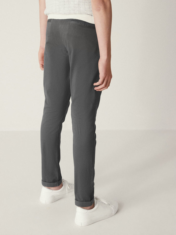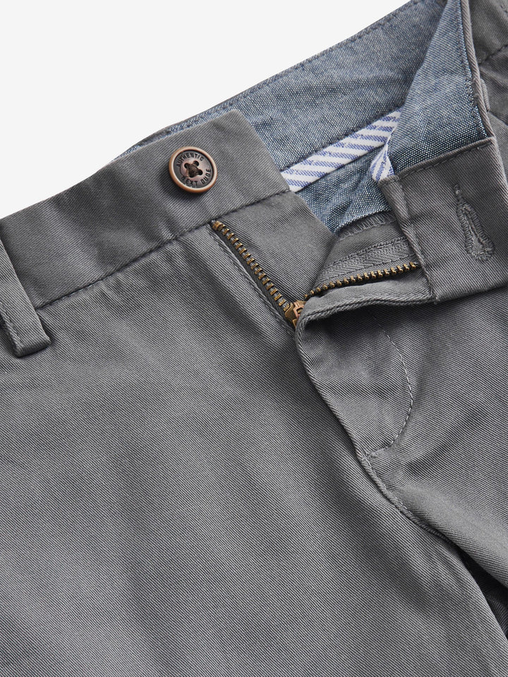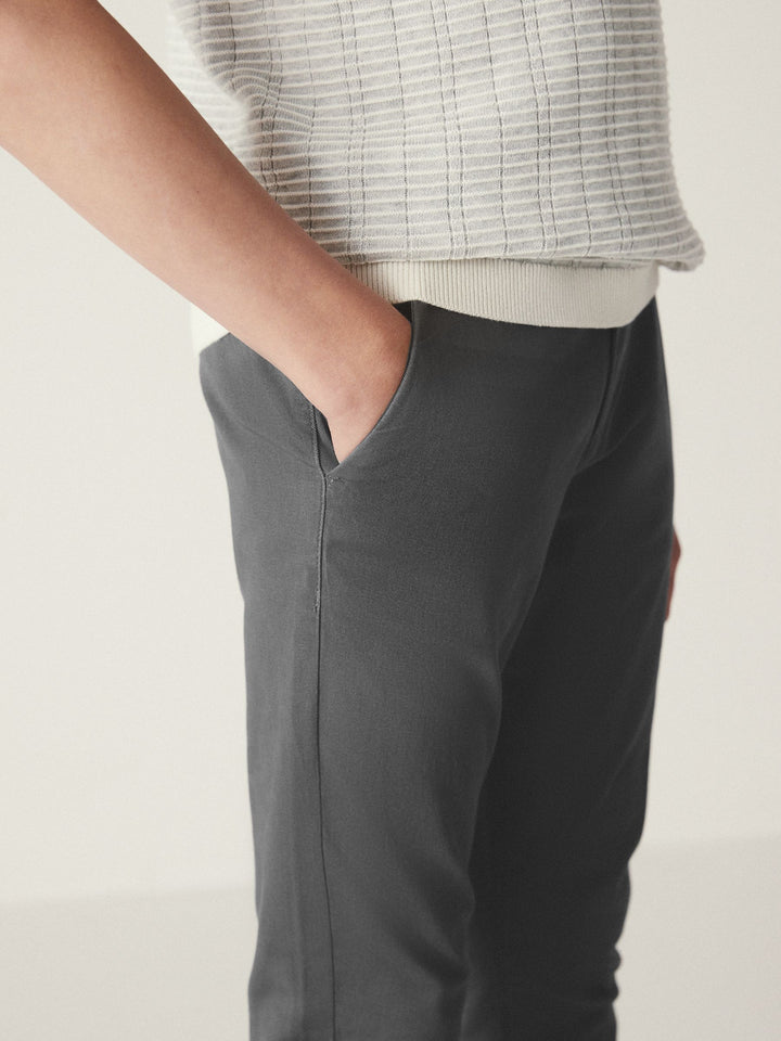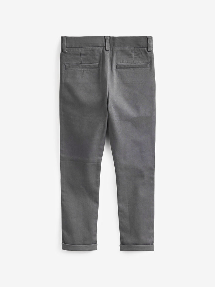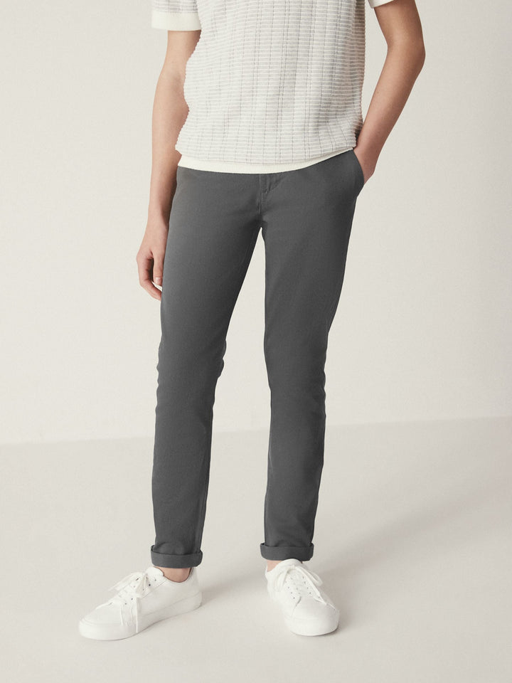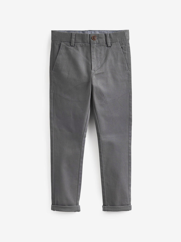 These easy-to-wear charcoal grey trousers are made of soft cotton with added stretch for comfort. Designed with traditional chino styling, they work equally well for their casual wardrobe as they do for their partywear edit.Keep the look low key with laid back t-shirts or take it through to party season with a smart shirt and belt. Chino style Comfort stretch Turn-up hem Button fastening Belt loops Adjustable waist Skinny fit 98% Cotton, 2% Elastane. Country of Origin: Bangladesh