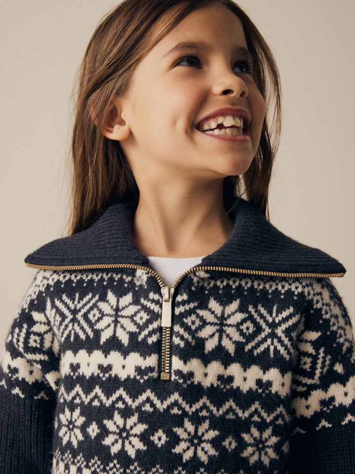 Christmas isn't Christmas without matching family jumpers. This stylish monochrome patterned knitted jumper features a flattering zip neck and collar to elevate your festive looks. Crafted in a soft touch warm handle knit with a relaxed, this statement novelty piece will add some festive cheer to their winter wardrobe. Christmas jumper Soft knit Zip neck Matching family items available 42% Acrylic, 30% Nylon, 28% Polyester. Country of Origin: China