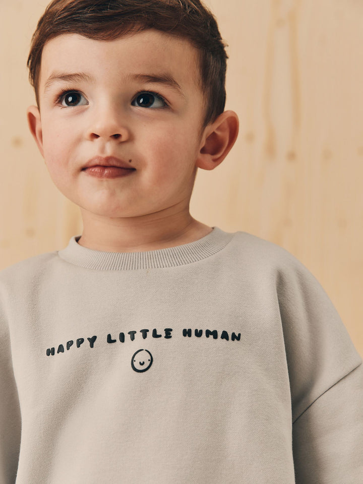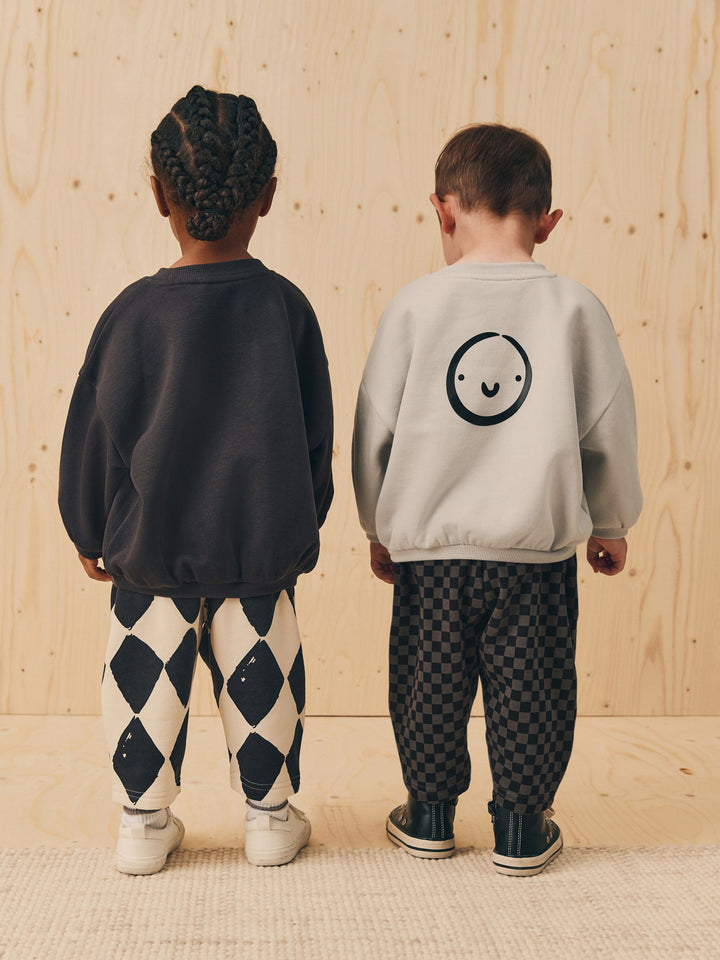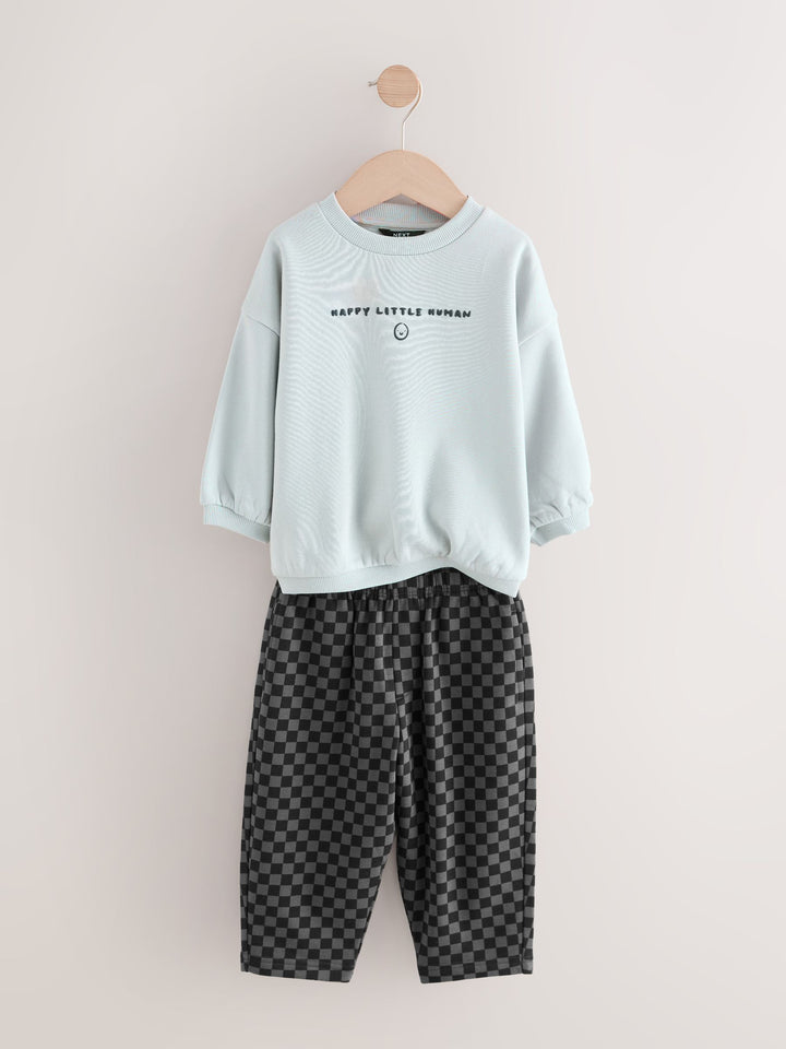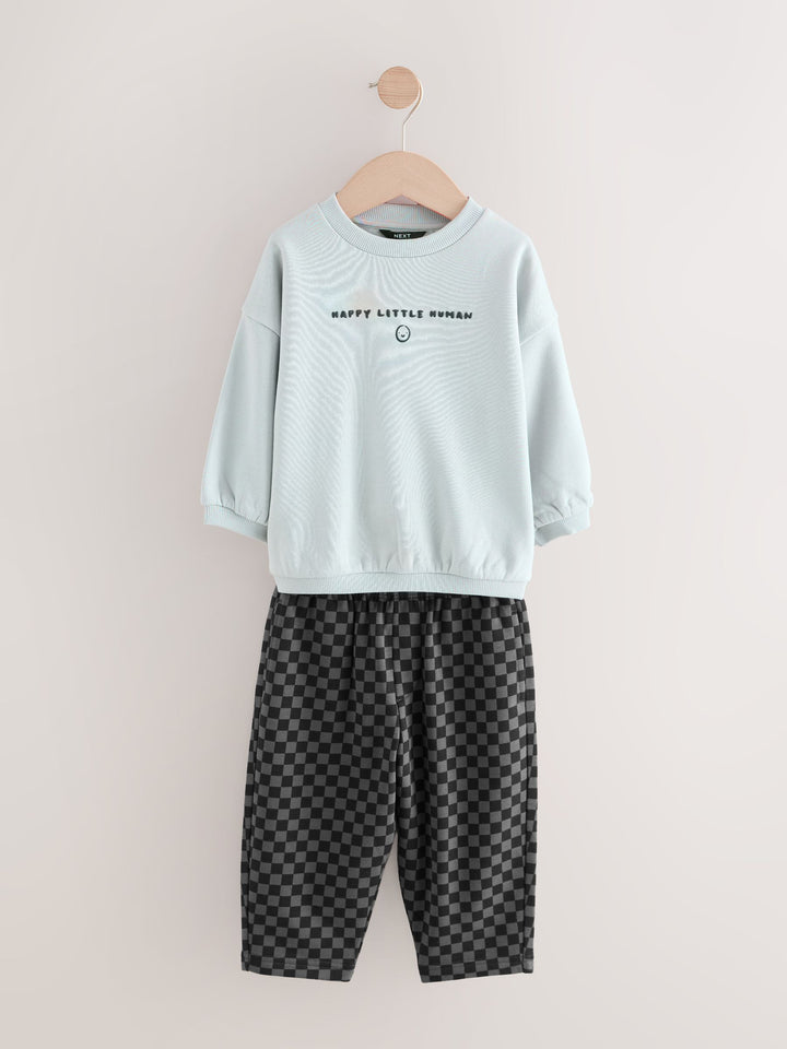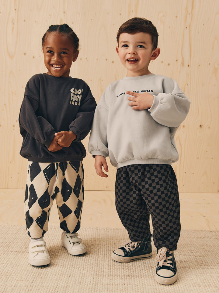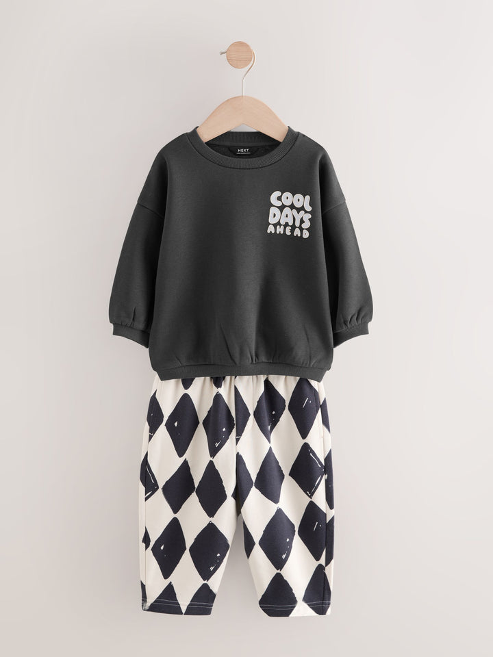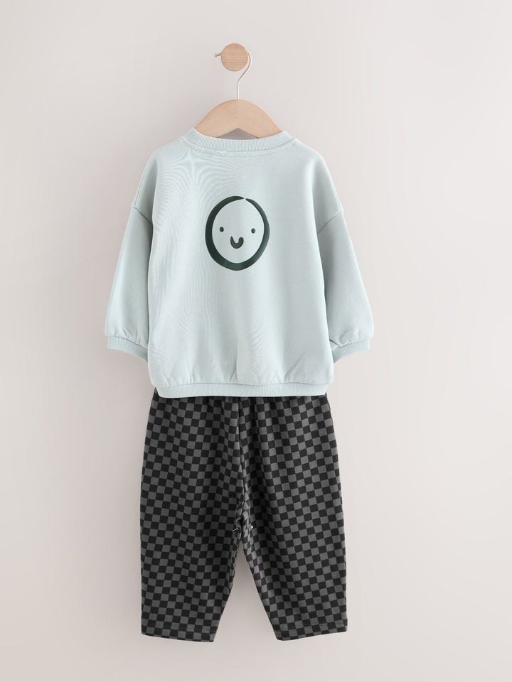 Our sweatshirt and stripes joggers set was made for having effortless styling. This two-piece set is made from breathable cotton and features a black sweatshirt and stripey printed joggers. Perfect for his outdoor adventures, add this to his rotation for a seamlessly stylish look. Two piece set 100% Cotton Sweatshirt with a smiley face Elasticated joggers Pockets Machine washable. Sweater light grey, Jogger checkerboard, Sweater charcoal and Jogger Harlequin 80% Cotton, 20% Recycled polyester. Country of Origin: Bangladesh