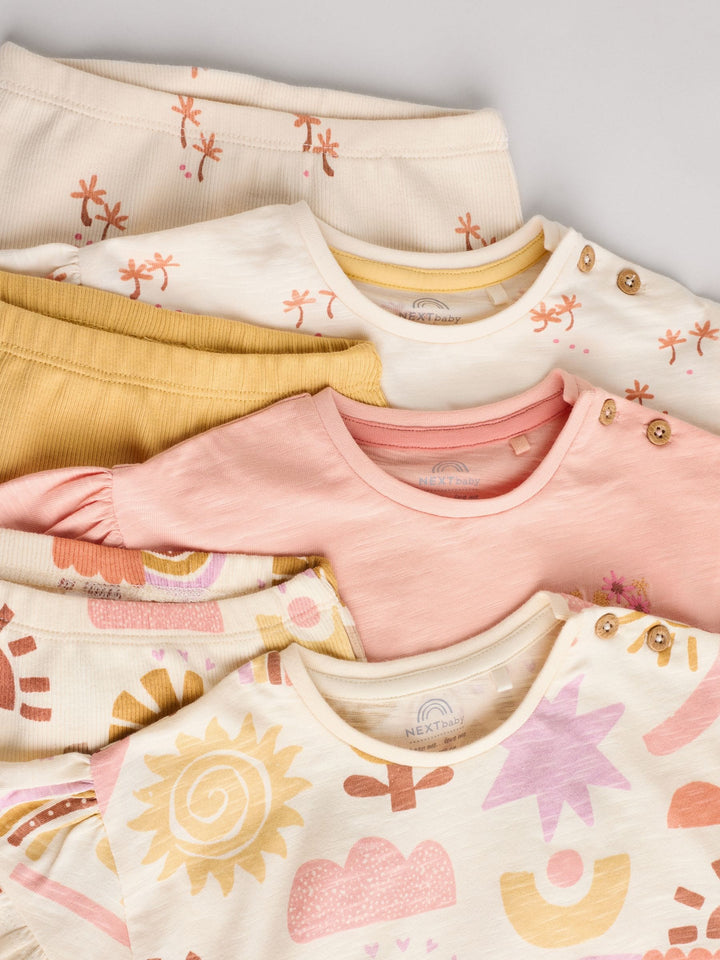 Refresh their rotation with this multipack of top and leggings. Featuring 3 pairs of matching tops and leggings all made from a cotton rich blend, this 6 piece set is perfect for growing their everyday essentials. 6 piece set Cotton rich Elasticated leggings Graphic print T-Shirts Button neck opening Machine washable. T-shirt, T-shirt and T-shirt 100% Cotton. Leggings, Leggings And Leggings 95% Cotton, 5% Elastane. Country of Origin: India Warning: Keep away from fire and flames.