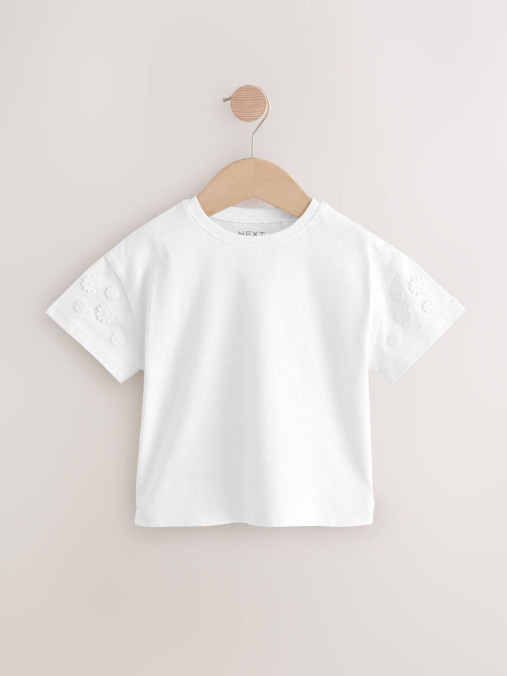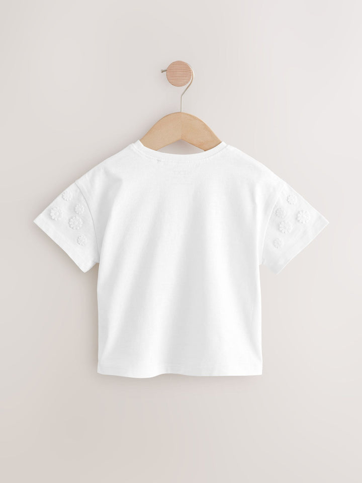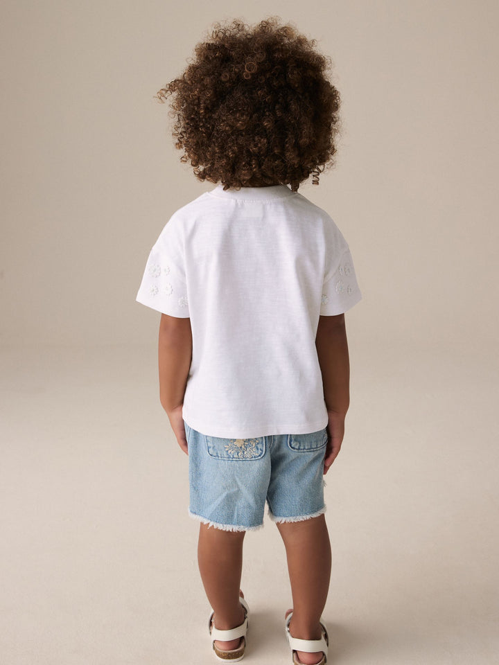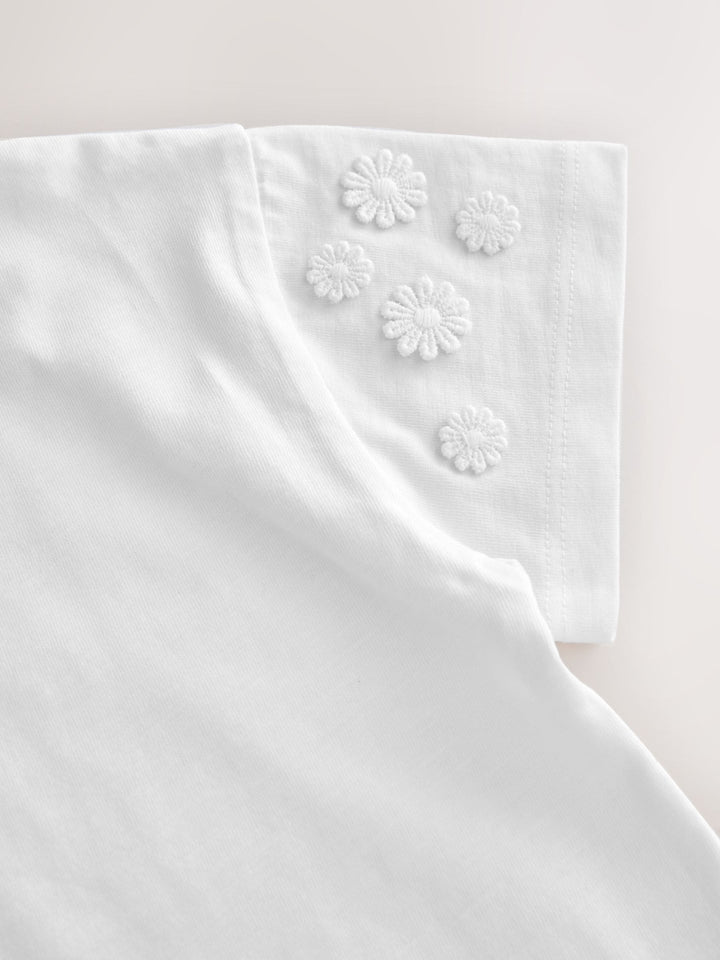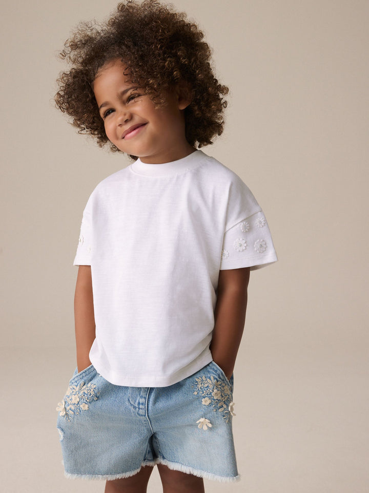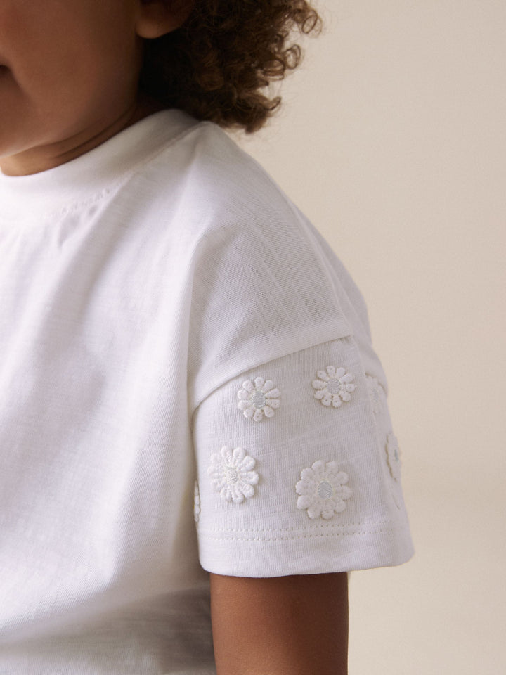 Made from pure cotton, this cream short sleeve t-shirt has pretty embroidered daisy detailing and a crewneck collar, perfect for adding a statement look to their everyday outfits. 100% cotton Embroidered daisy detailing Crewneck collar Machine washable. 100% Cotton. Country of Origin: Bangladesh