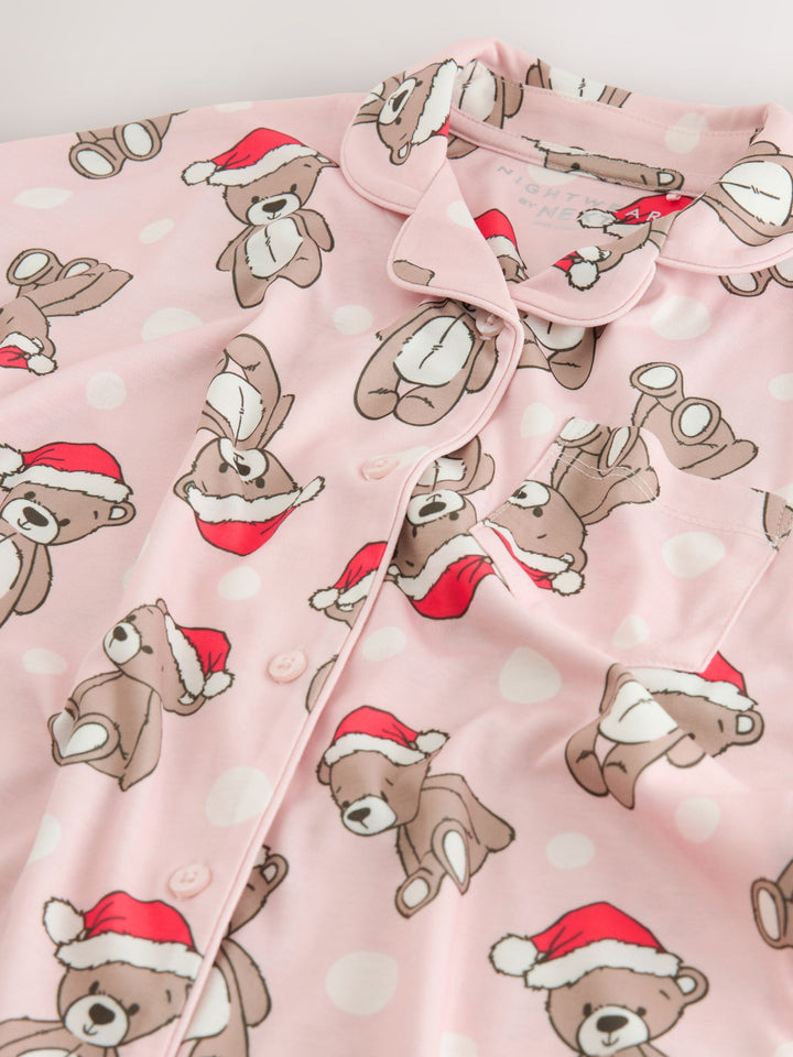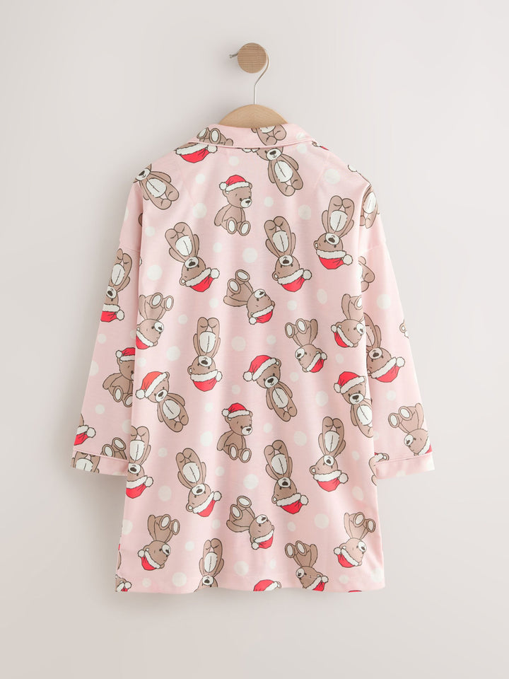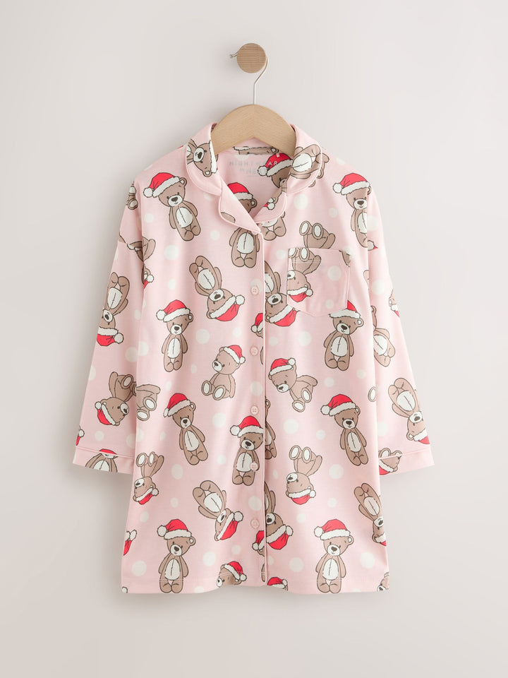 Get into the festive spirit with this adorable Christmas nightie. The soft, cosy fabric and playful novelty Christmas print featuring bears in Santa hats ensure she stays comfortable and snug. With a button-through fastening and a classic collar, it's a charming choice for her bedtime routine throughout the holiday season. Novelty Christmas Print Nightie style Button-through fastening Classic collar Soft, cosy fabric Machine washable. 100% Recycled polyester. Country of Origin: China Warning: Keep away from fire and flames.