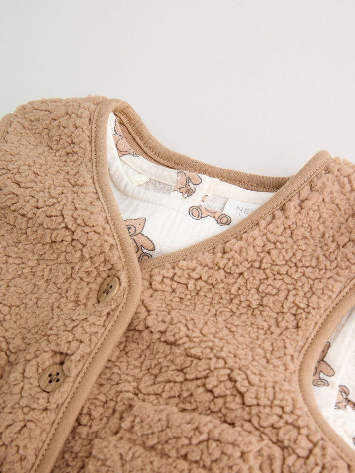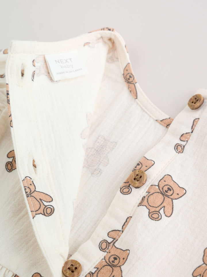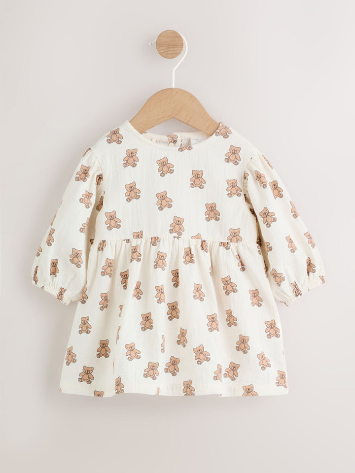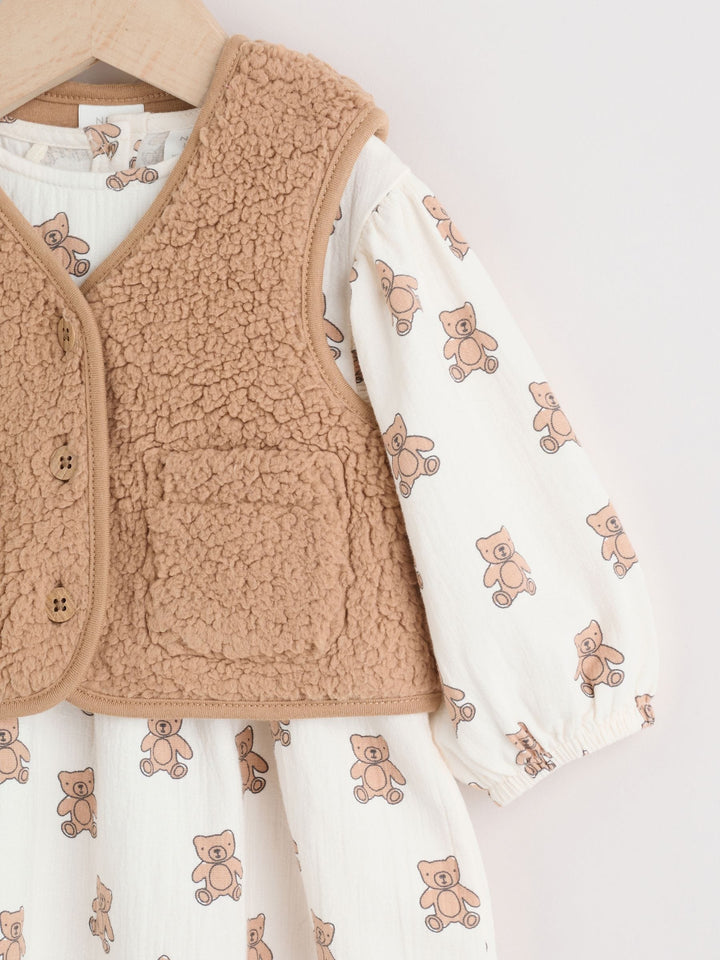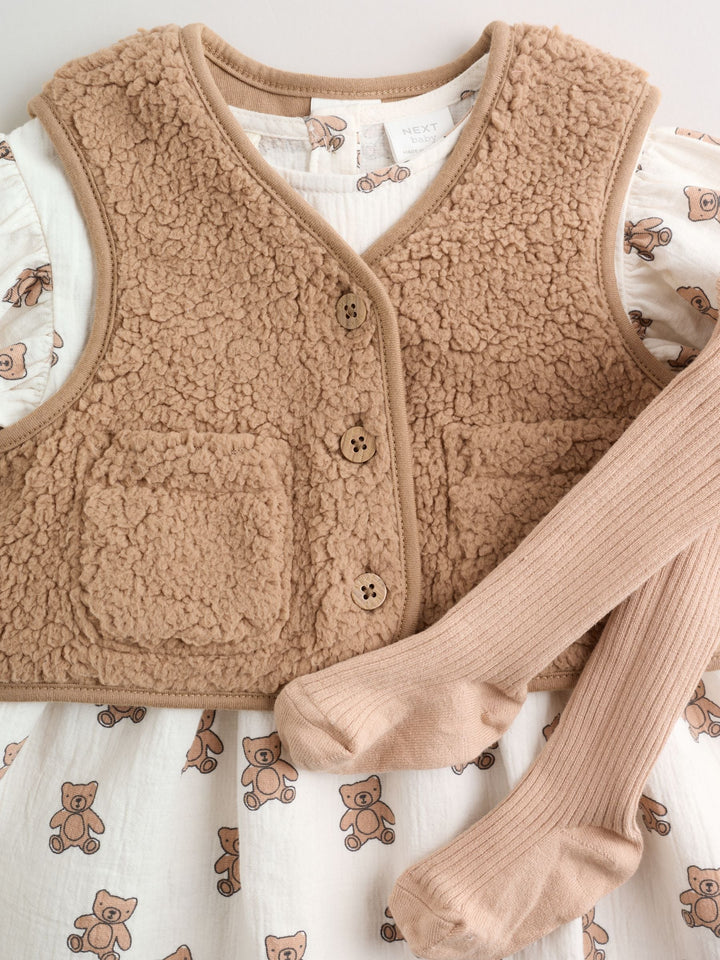 Cream/ Brown Bear Long Sleeve Baby Dress and Waistcoats with Tights 3 Piece Set (0mths-2yrs)