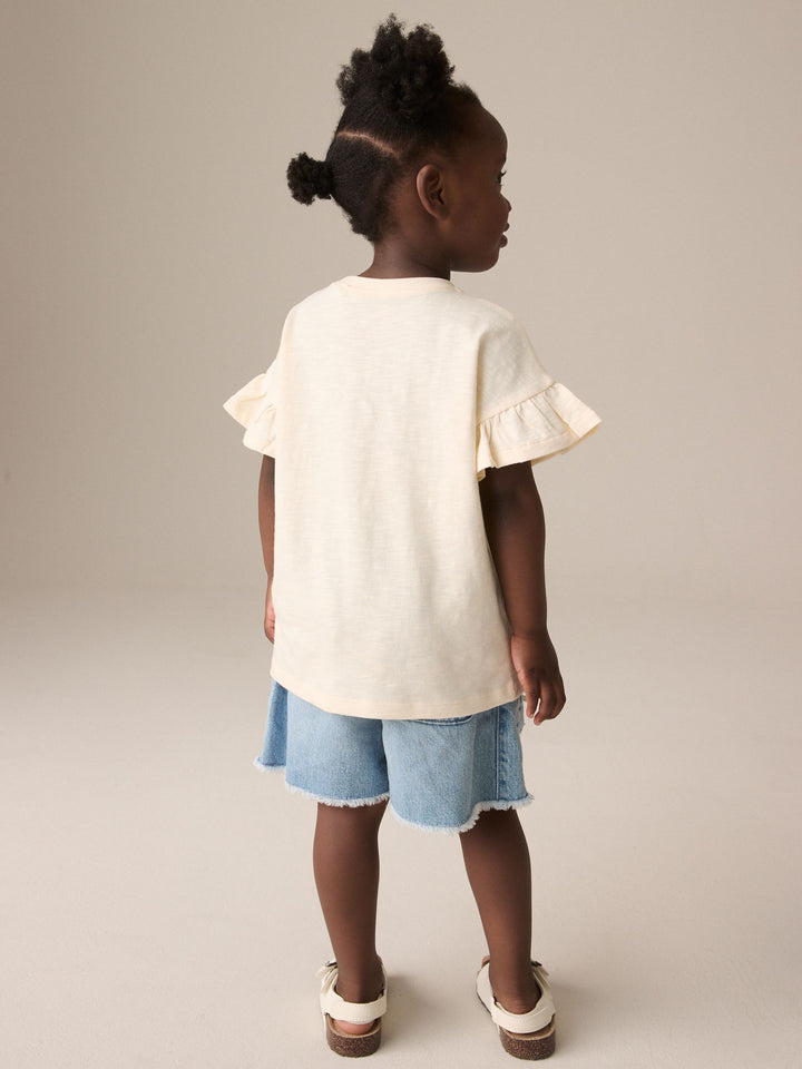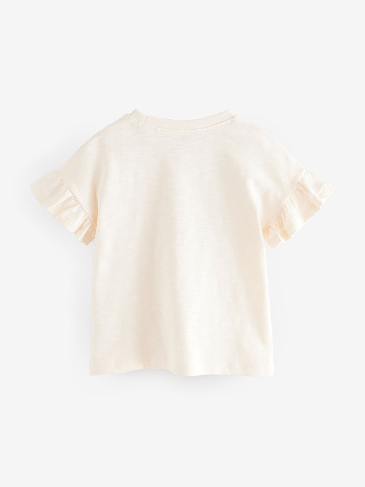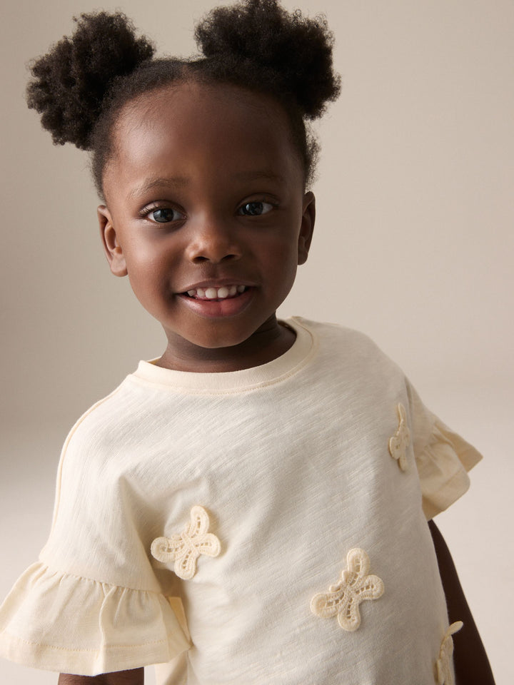 Made from pure cotton, this pretty cream t-shirt has 3D tonal butterfly detailing with ruffle shirt sleeves, finished with a crewneck collar. 100% cotton Butterfly Applique detailing Ruffle short sleeves Crewneck collar Machine washable. 100% Cotton. Country of Origin: Sri Lanka
