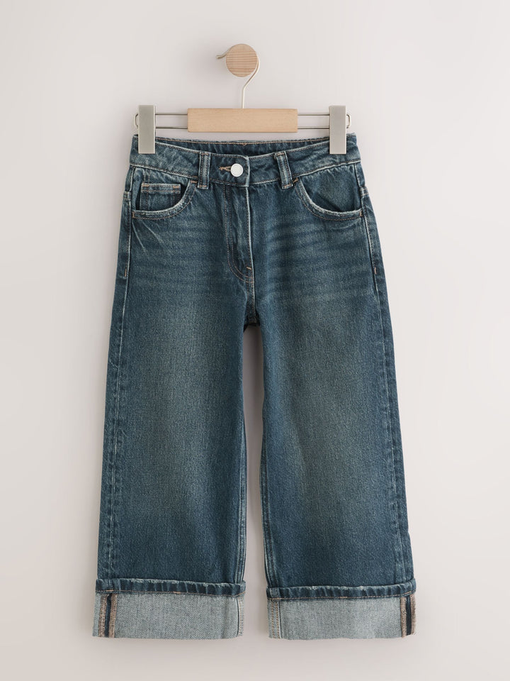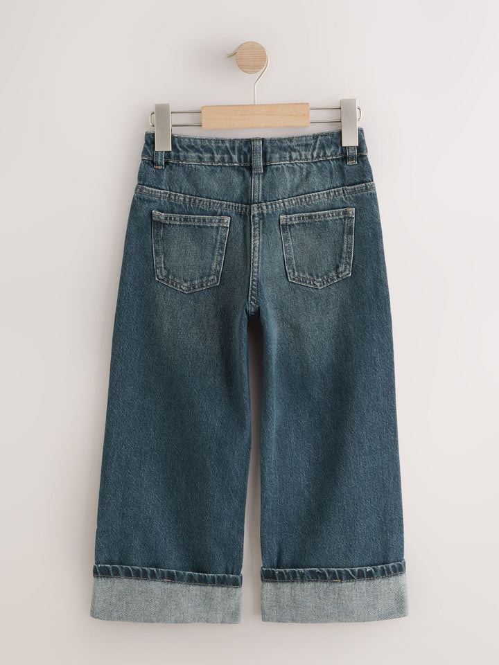 Add a trendy twist to their denim collection with these wide-leg, dark-blue jeans. The turn-up hem and classic button-and-zip front fastening provide a stylish look, while the functional pockets offer a practical finish. An ideal choice for a fashionable, everyday look. Denim Button and zip-front fastening Wide leg Turn-up hem Pockets 100% Cotton. Country of Origin: Bangladesh