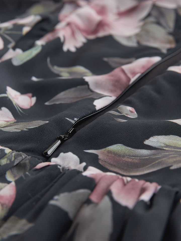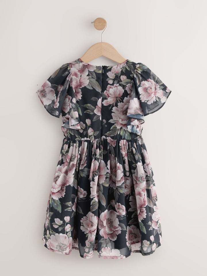 Dark Floral Print Angel Sleeve Embellished Dress (3-16yrs)
