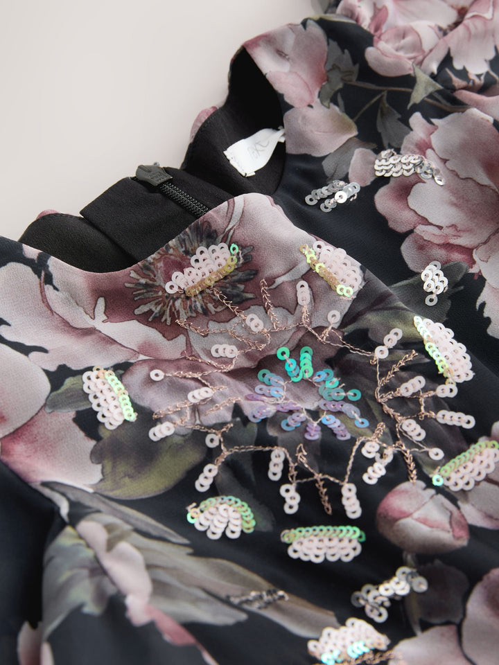She'll feel like a princess in this gorgeous dress, featuring chiffon fabric with delicate embroidery, sequin detailing and ruffle short sleeves, finished with a zip fastening to the back. Regular fit Chiffon fabric Embroidery Sequin detailing Zip fastening to the back Main 100% Recycled polyester. Lining 100% Recycled polyester. Country of Origin: India