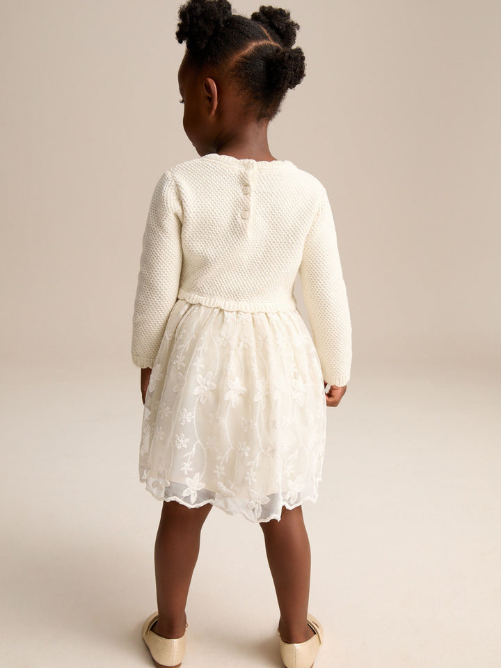 Knit top Mesh skirt Long sleeve Beautiful embroidery Button fastening at neck Let her be the best dressed guest wherever she goes in our 2-in-1 occasion knit dress. This stunning frock features a long sleeve silhouette with a floaty mesh skirt. Coated in beautiful embroidered detailing with scallop trim edging, this dress is finished with a button fastening on the back for a comfy fit. Main 100% Cotton. Skirt 100% Nylon. Lining 100% Cotton. Country of Origin: India