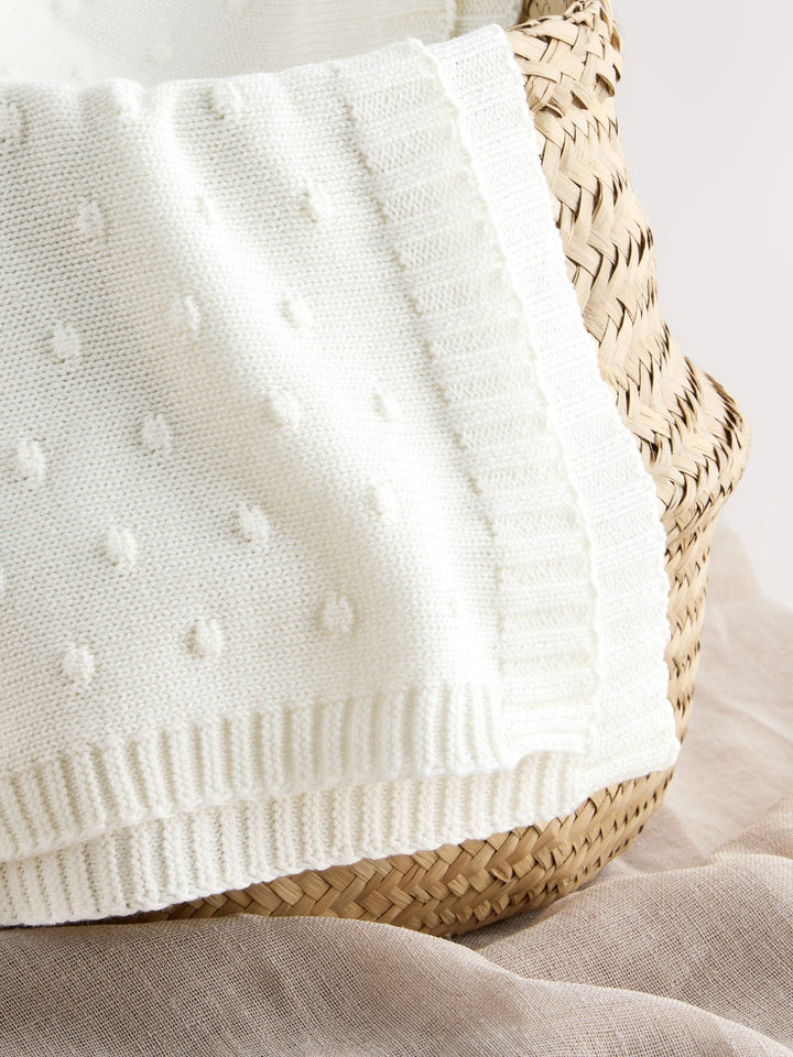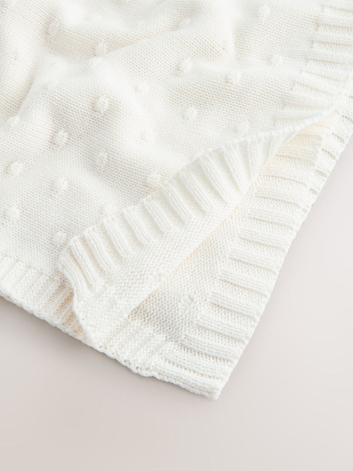 This beautiful baby blanket is the perfect gift for any new or expecting parent. Its soft, cosy knit and charming bobble detail are perfect for snuggling up at home or keeping babies warm in their pushchair. Use with caution to ensure your baby doesn't overheat, and avoid covering their face while sleeping. Bobble detail Soft knitted fabric Ideal for pushchair or snuggling Beautiful gift Ribbed edge Machine washable. 100% Cotton. Country of Origin: China Warning: Keep away from fire and flames.