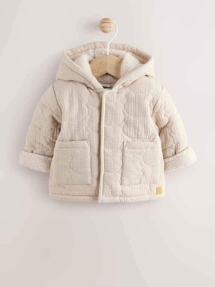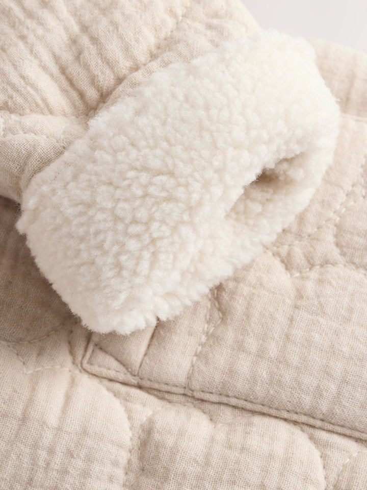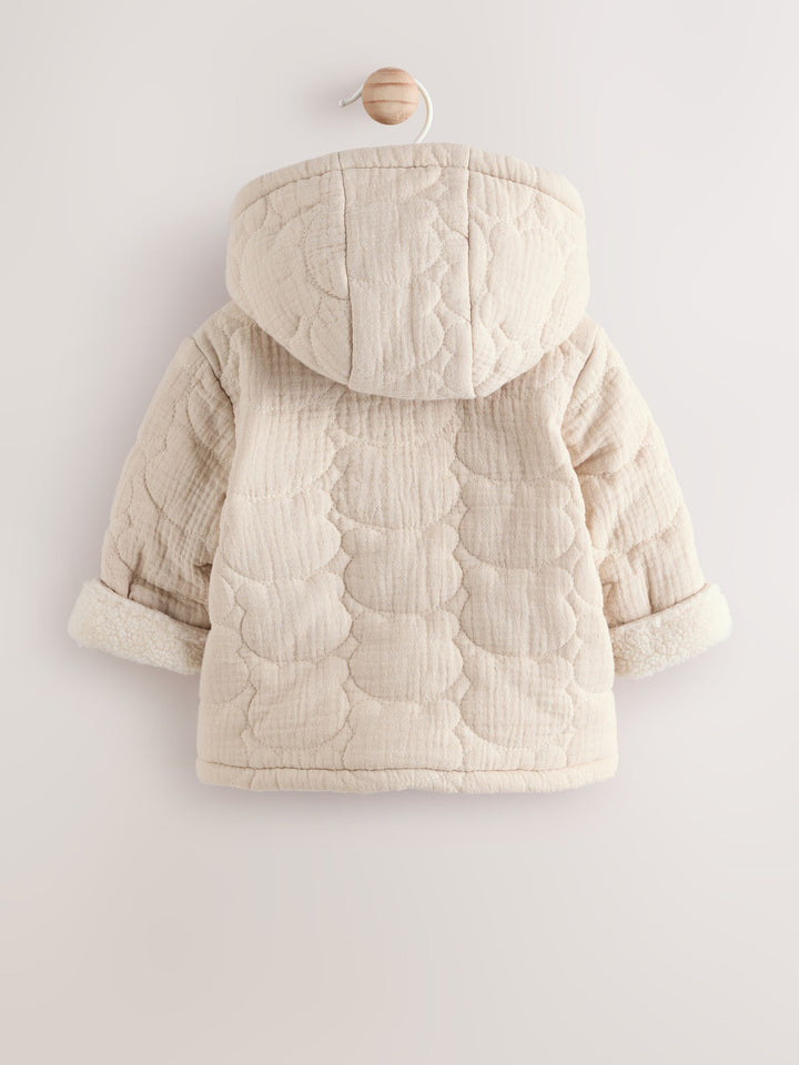 This cosy zip-through jacket features a stitched all-over quilted design in a cute bear shape, with a warm borg fleece lining, a turn-up sleeve cuff and square patch pockets, finished with a set-in hood. 100% cotton main fabric Bear-shaped quilted pattern Fleece lining Zip fastening Patch pockets Turn-up sleeve cuffs Machine washable. Main 100% Cotton. Lining 100% Recycled polyester. Wadding 100% Recycled polyester. Country of Origin: China Warning: Keep away from fire and flames.