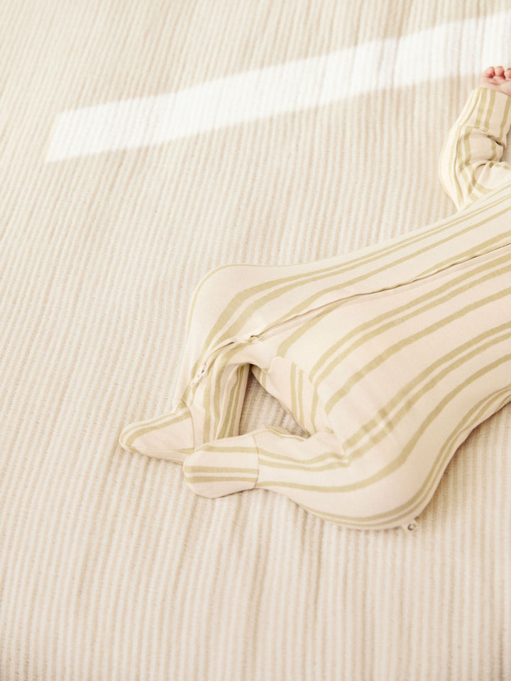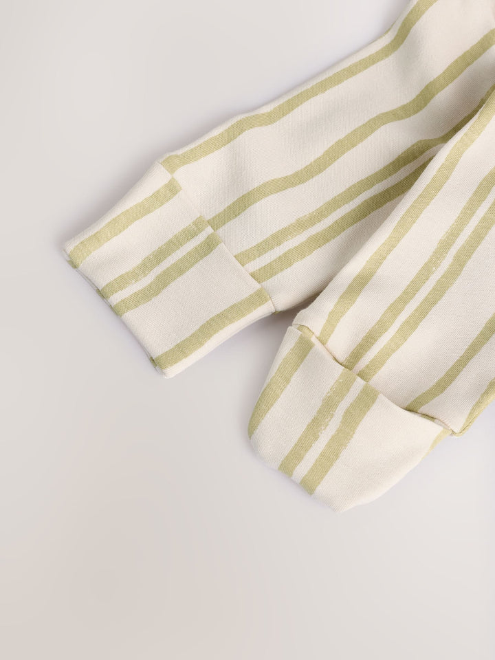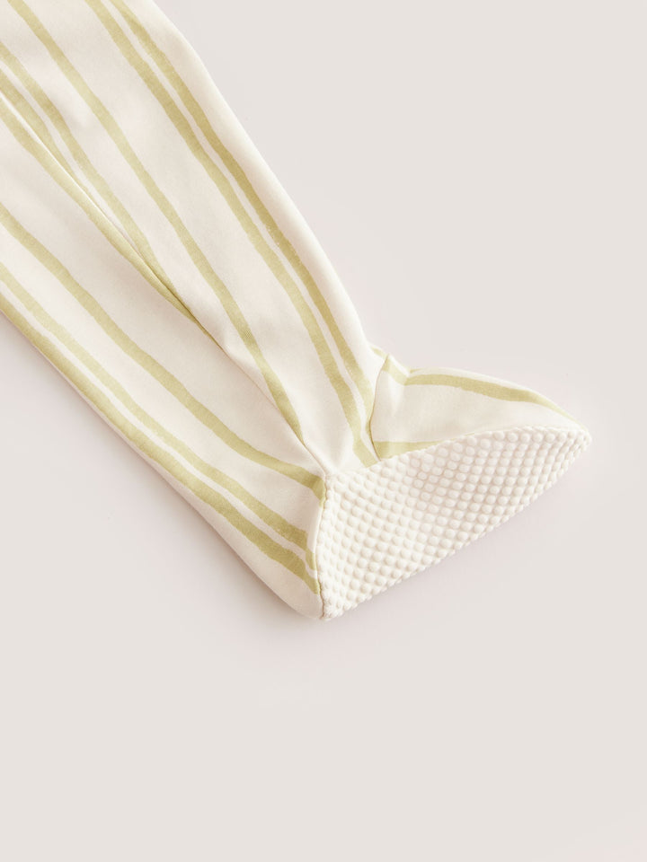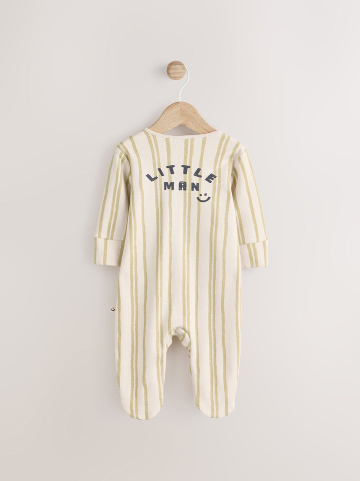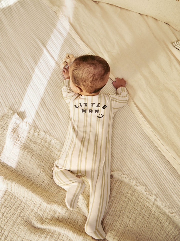 With a super cute 'Little Man' slogan print to the chest and an all-over neutral stripe, this cosy pure-cotton sleepsuit has a two-way zip fastening for easy changing. For added comfort, turn-back scratch mitts have been added for up to 3-6 months, alongside an anti-slip sole print from 9-12 months. 100% cotton Two-way zip 'Little Man' slogan Machine washable. 100% Cotton. Country of Origin: India Warning: Keep away from fire and flames.