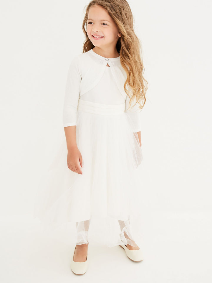 Perfect for special occasions, our shrug Ecru cardigan is the ideal extra layer to wear over their pretty party look. Cotton rich and super soft, this adorable long sleeve cardigan is finished with a sparkly gem button fastening. Gem button fastening Cotton rich Long sleeves Machine washable. 55% Cotton, 38% Nylon, 7% Viscose. Country of Origin: Myanmar