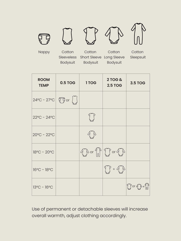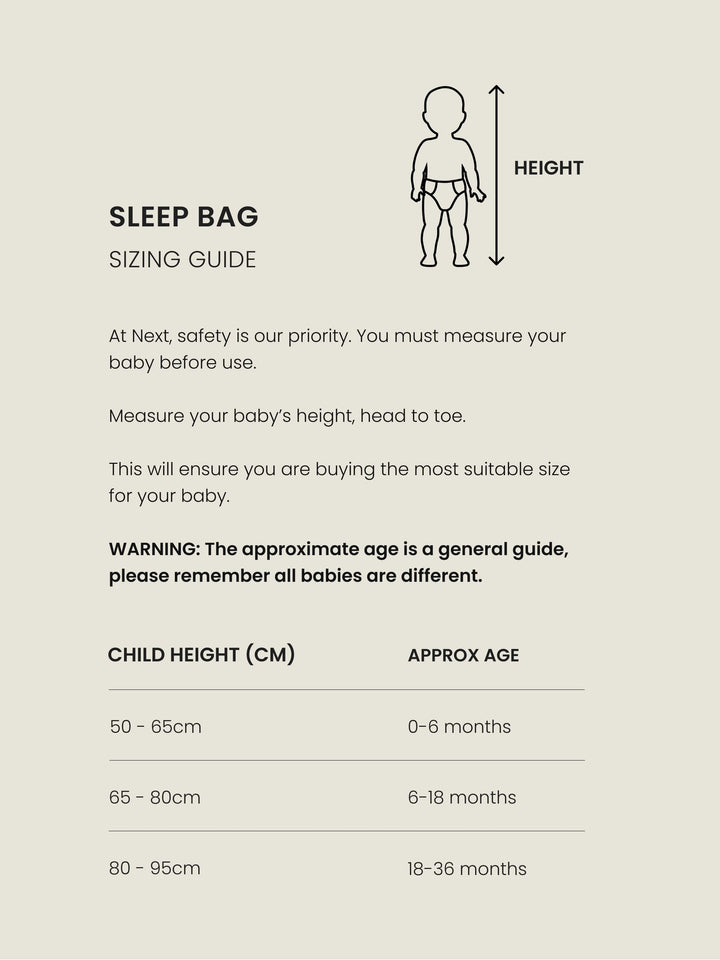Our baby sleep bags are perfect for keeping your little ones warm in the cooler temperatures. This sleep bag boasts a 2.5 Tog rating, with a zip fastening for easy wear. Zip fastening 2.5 Tog rating Adjust clothing layers to room temperature to keep your baby warm and comfortable, but not too hot. Ideal room temperature of 16-20 Degrees Celsius Check for signs of wear or damage Wash the sleeping bag before its first use Place your baby on its back to sleep Do not fold any spare material beyond the child's feet over its legs Do not let anyone smoke in the same room as the baby This sleepbag is for use in a cot or crib Conforms to BS EN 16781:2018: Do not use if the child can climb out of the cot Do not use in combination with other bedding items (e.g. cot duvet) Overheating can endanger the life of your child Do not use if the child's head can pass through the neck opening when fastened for use Ensure that the neck and arm openings are securely fastened Not suitable for babies under the height of 50cm At Next, safety is our priority. You must measure your baby before use. Measure your baby's Height from head to toe. This will ensure you are buying the most suitable size. The Approximate Age is a general guide, please remember that all babies are different. Height 50-65cm: Approximate Age 0-6 Months Height 65-80cm: Approximate Age 6-18 Months Height 80-95cm: Approximate Age 18-36 Months Warning: Keep away from fire and flames. Machine washable. Main 100% Cotton. Lining 100% Cotton. Wadding 100% Recycled polyester. Trim 100% Cotton. Country of Origin: China WARNING! Do not use if the child can climb out of the cot.