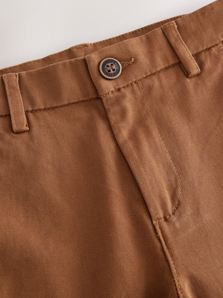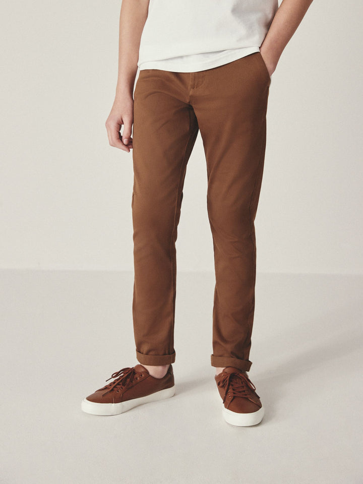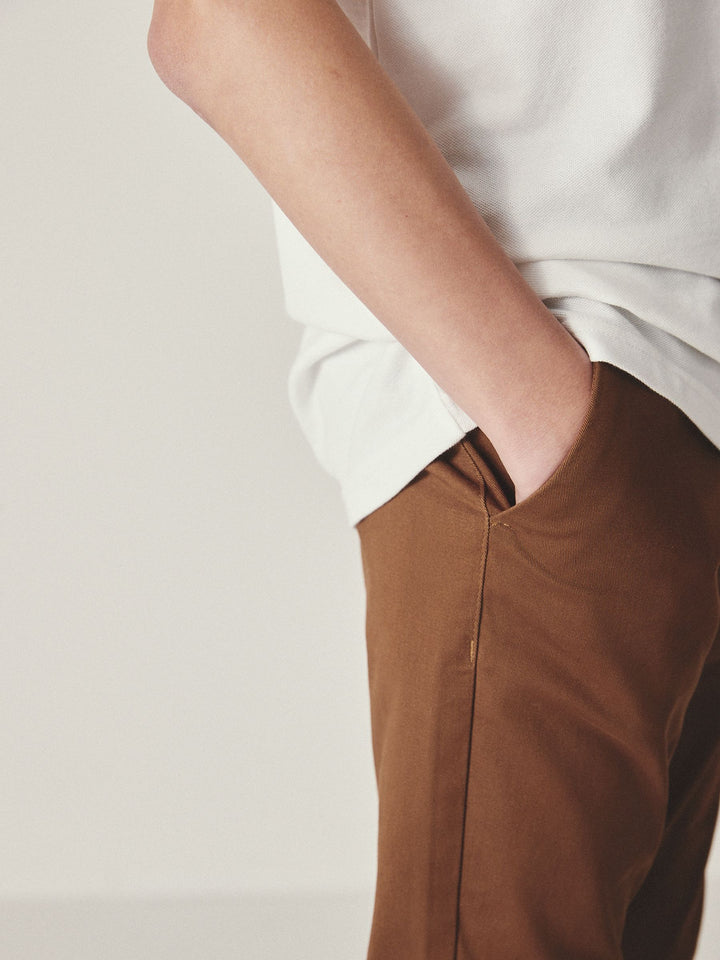 Our chino trousers in ginger, tan and brown are made for the young style set. With a comfortable stretch in their stride, these trousers lend a cool, relaxed vibe with a neat and tidy finish. Perfect for any occasion, pair them with a crisp shirt or go casual with a graphic T-Shirt. The adjustable waist ensures a perfect fit. 98% Cotton, 2% Elastane. Country of Origin: Bangladesh