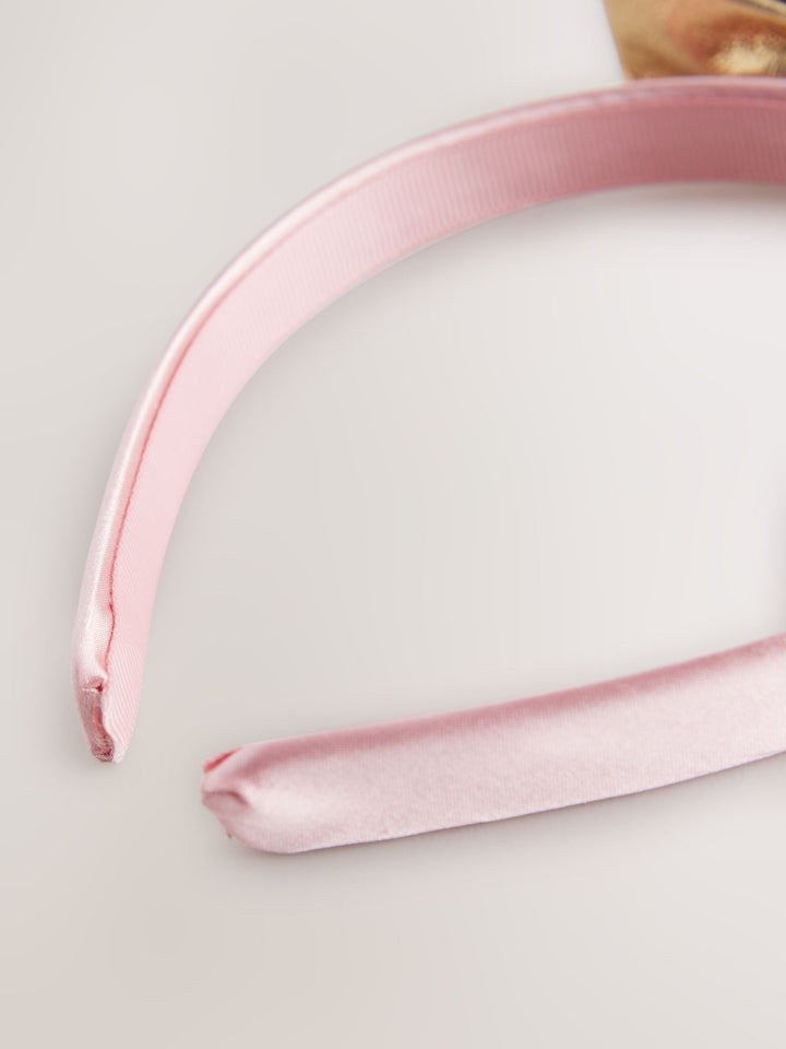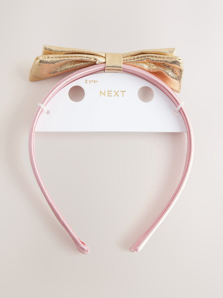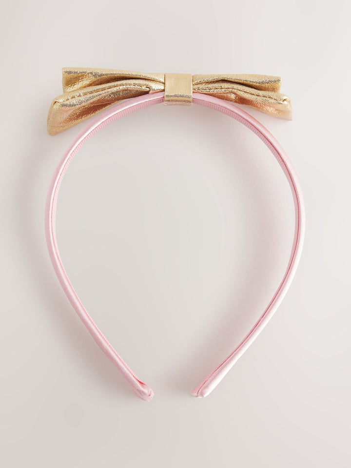 This cute Alice band has a pink textured fabric and gold bow detailing. 60% Polyester, 40% Metal. Country of Origin: China