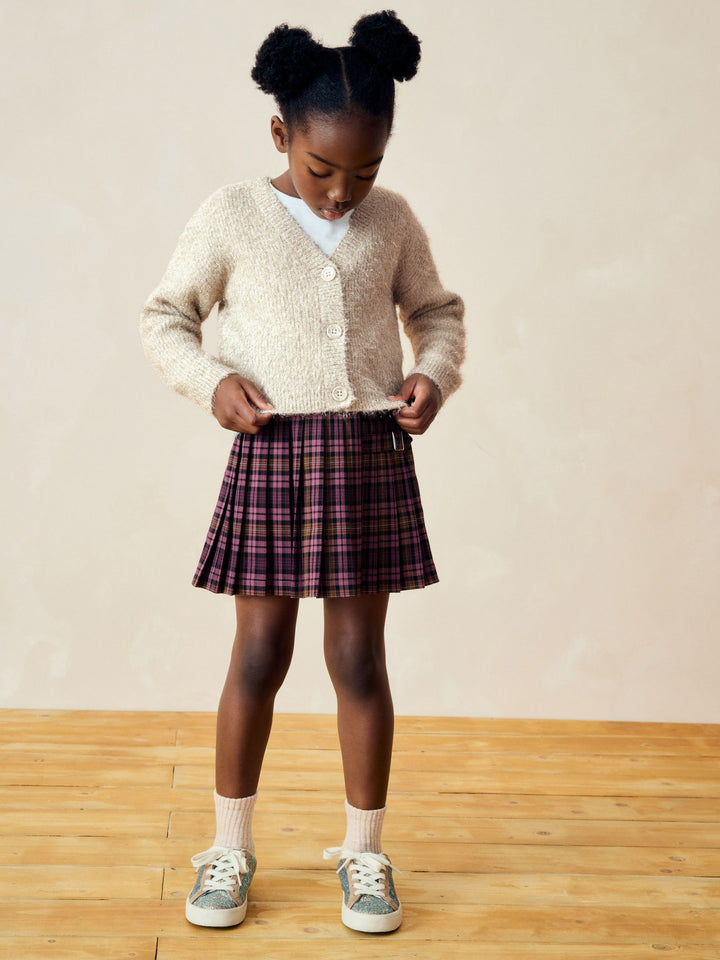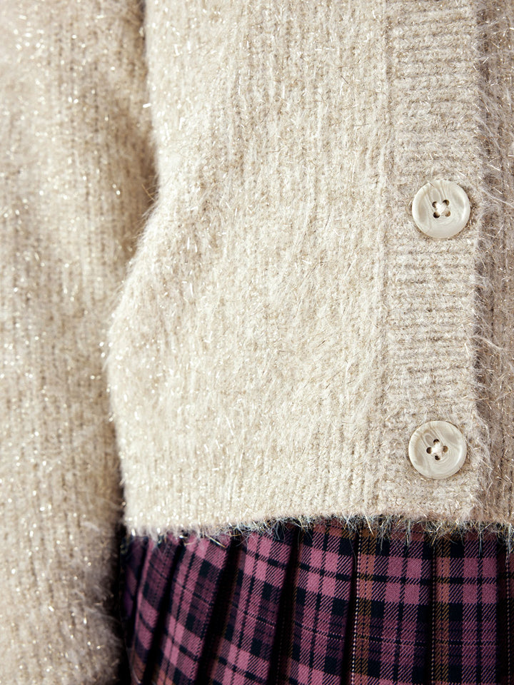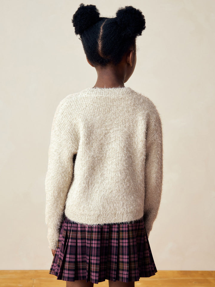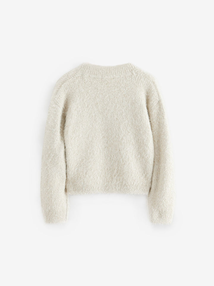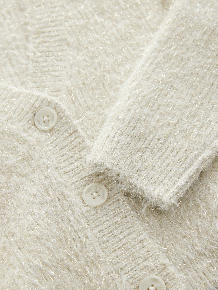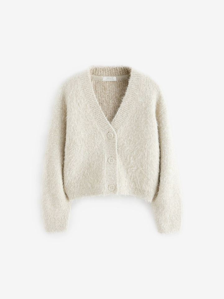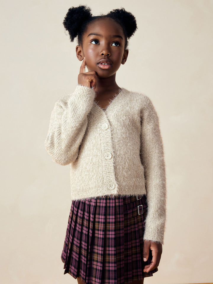 In a boxy fit, add a bit of sparkle to their winter wear with this cosy gold-tone cardigan, featuring a metallic tinsel-effect yarn and a fluffy fabric. The cardigan is finished with a V-neck collar and a button-up fastening. Boxy fit Fluffy fabric Sparkling tinsel yarn V-neck collar Button-up fastening 87% Nylon, 13% Metallised fibre. Country of Origin: Bangladesh
