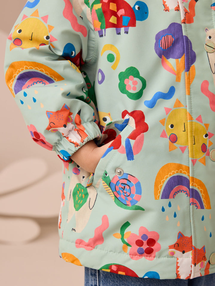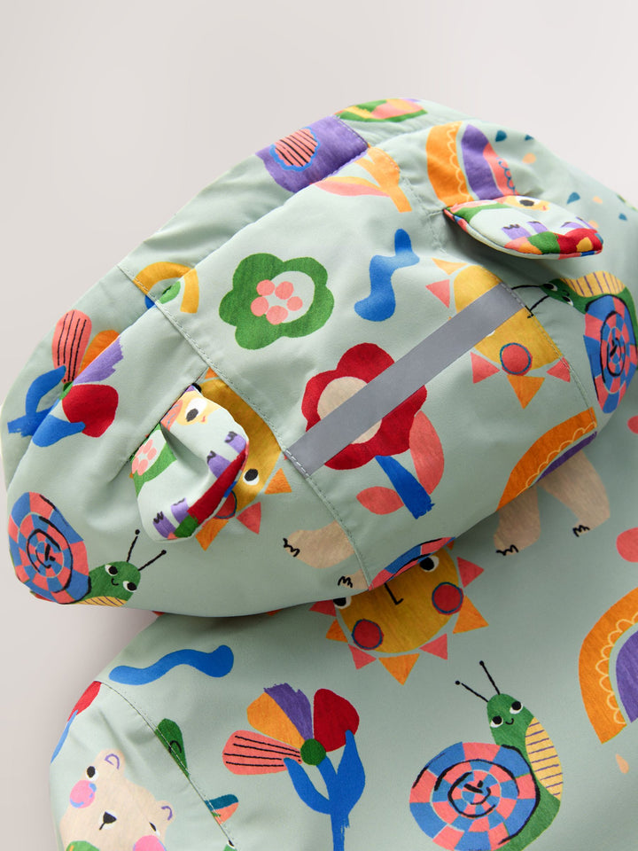 Stay dry in style with this green waterproof jacket. The taped seams and fleece-lined body and pockets provide ultimate warmth and comfort. The fun design of various characters and hood make it a perfect piece for keeping warm and dry on rainy days. Waterproof Taped seam Fleece-lined Machine washable. Main 100% Recycled polyester. Lining 100% Recycled polyester. Wadding 100% Recycled polyester. Country of Origin: Myanmar