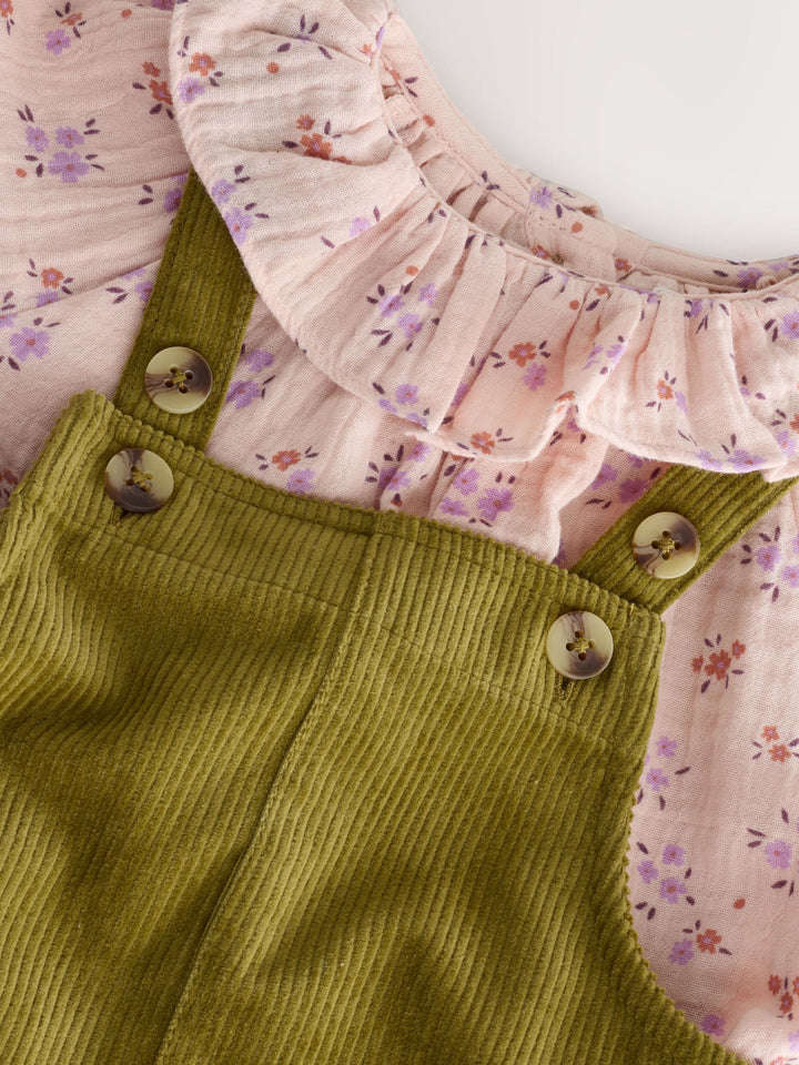 Green Floral Print Corduroy Dungarees Blouse and Tights Set (3mths-7yrs)
