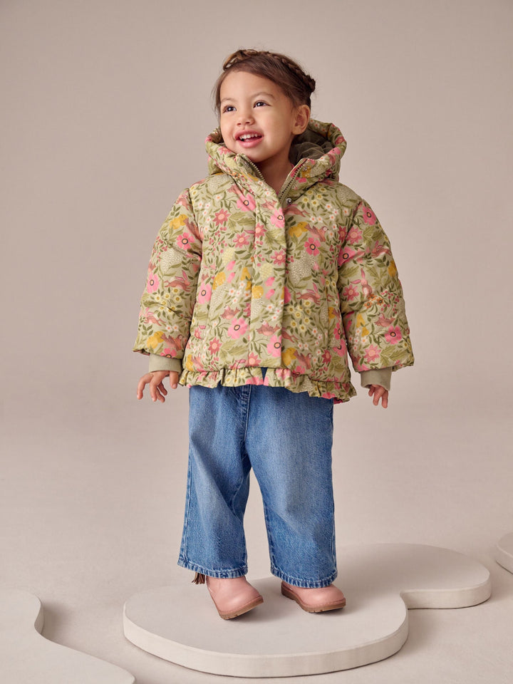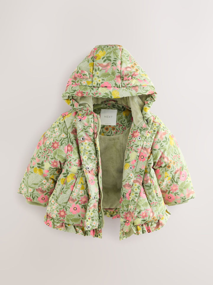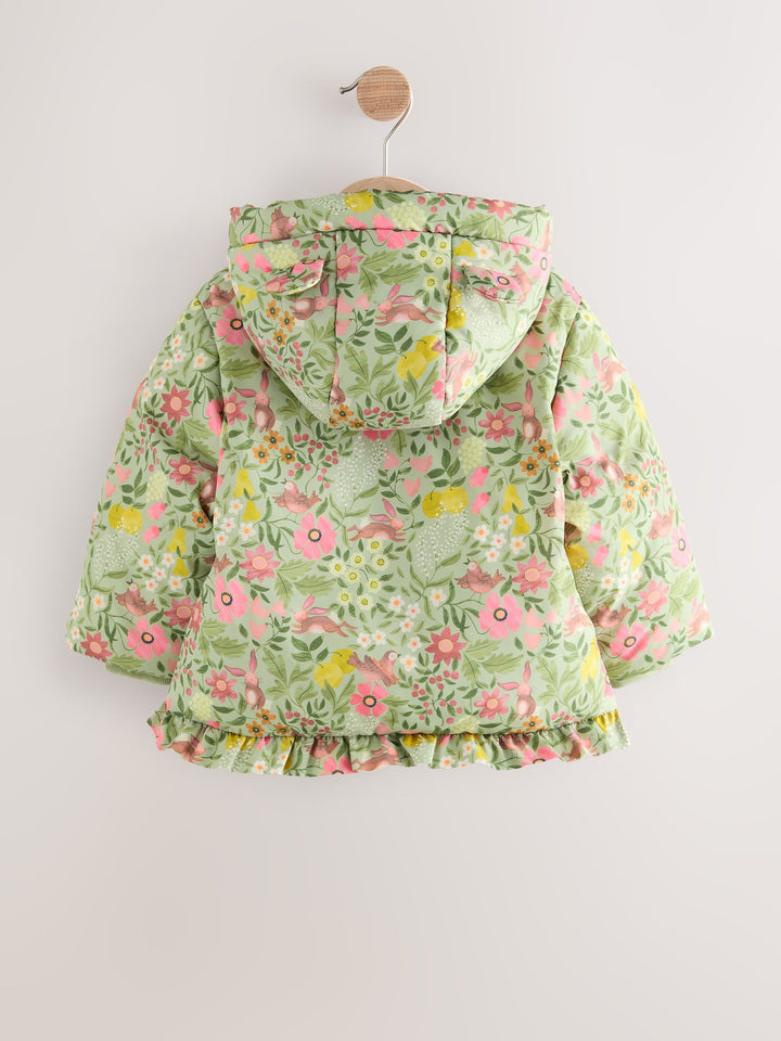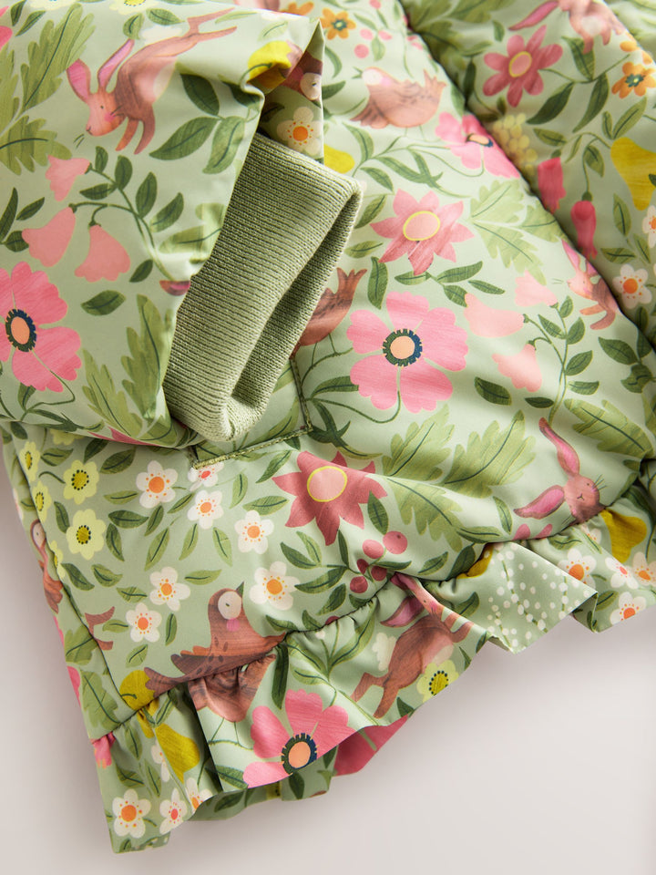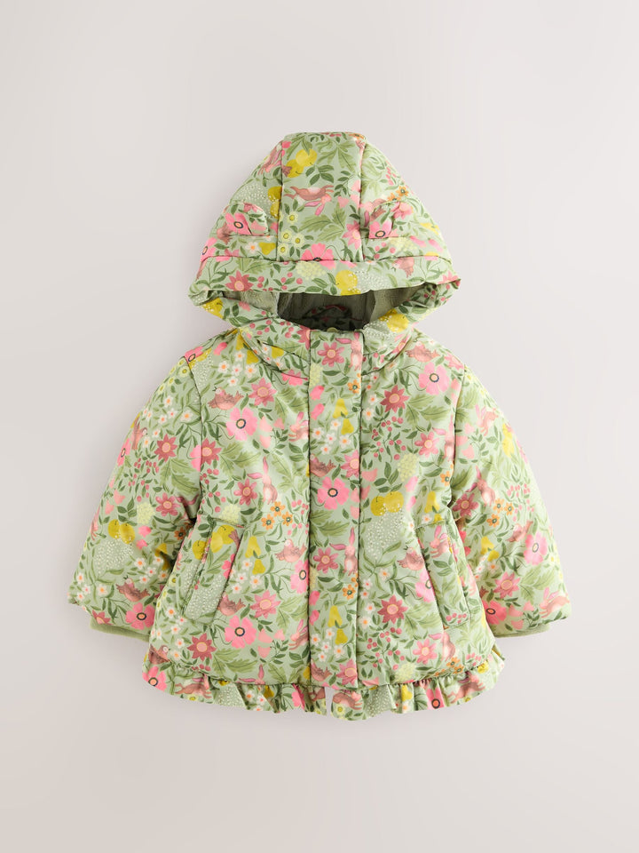Green Floral Shower Resistant Frill Hem Padded Coat (3mths-7yrs)