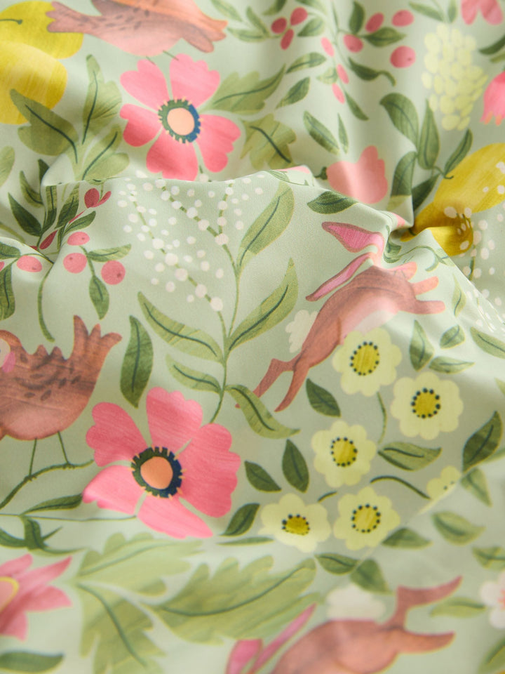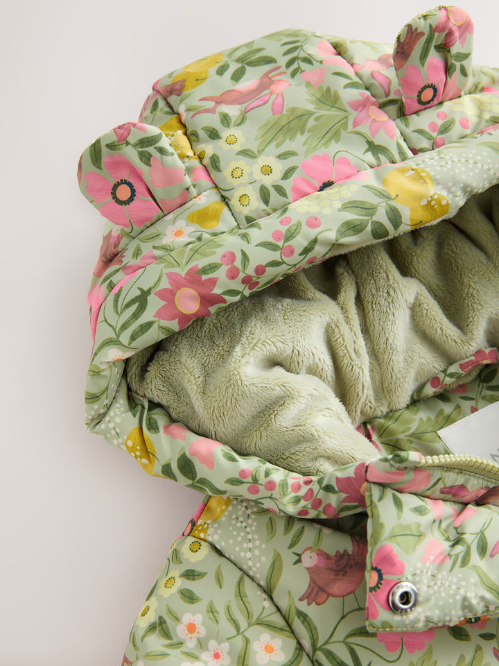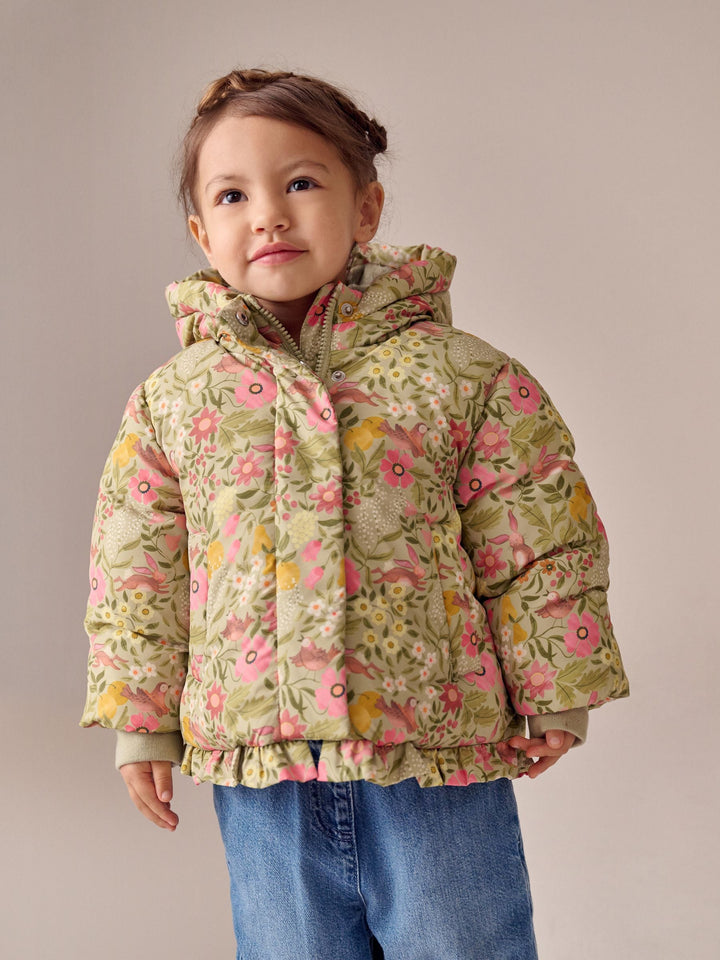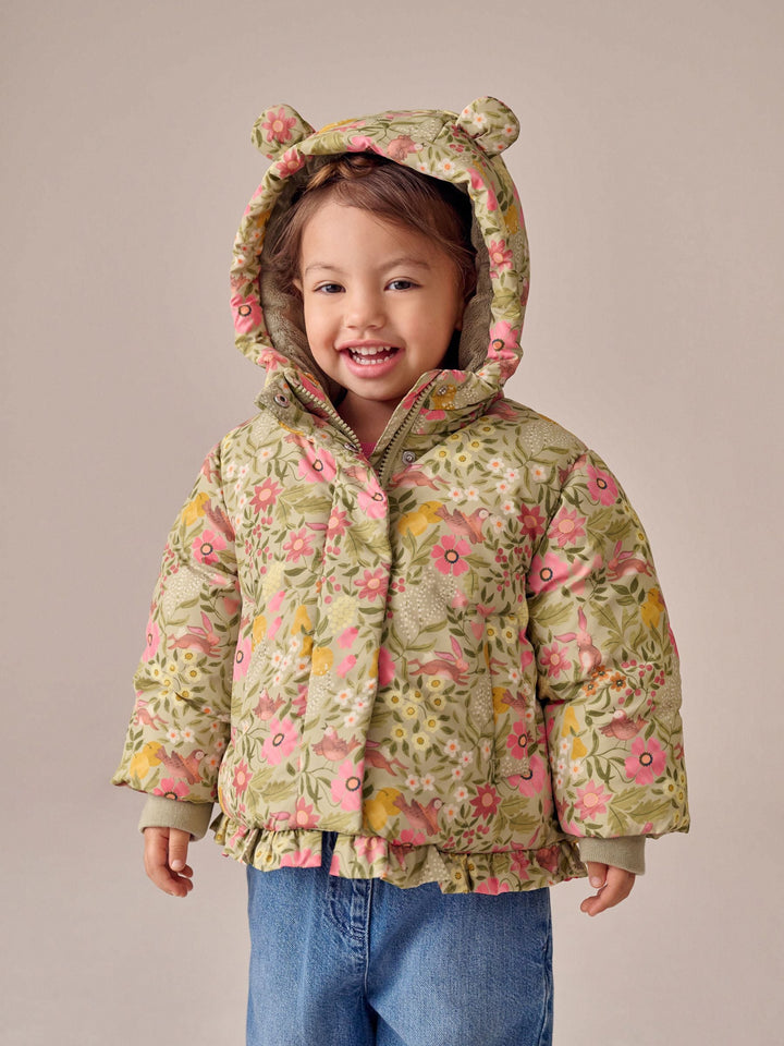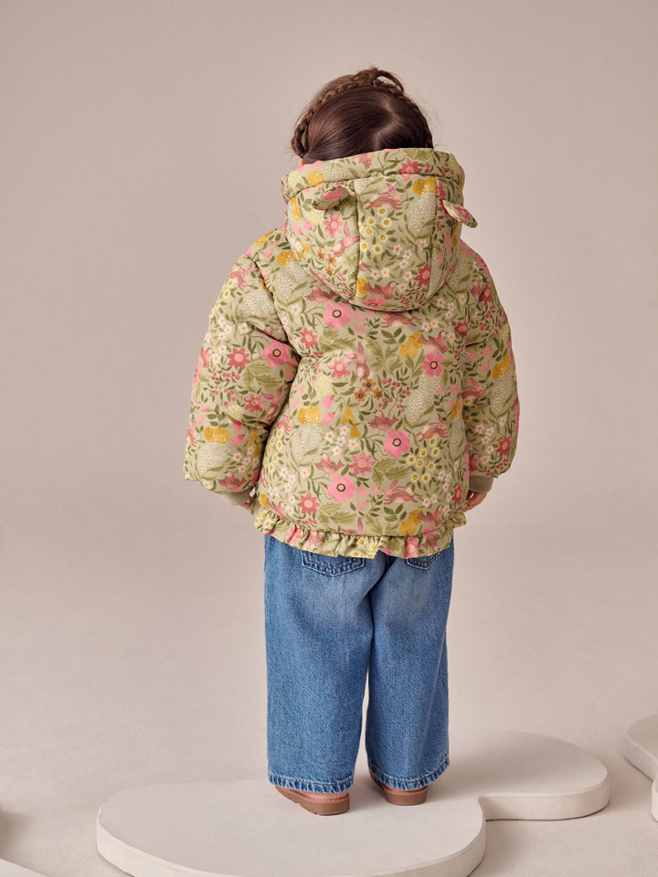 Ready for any weather, this green floral padded coat is a fun and stylish choice for their outdoor adventures. The shower-resistant fabric and cosy faux fur lining provide extra warmth and protection from the elements, while the playful frill hem adds a charming touch. The fun ears on the hood complete this cute and practical look. Shower resistant Faux fur lining Frill hem Padded Hooded with ears Popper fastening Machine washable. Main 100% Recycled polyester. Lining 100% Recycled polyester. Wadding 100% Recycled polyester. Country of Origin: Myanmar
