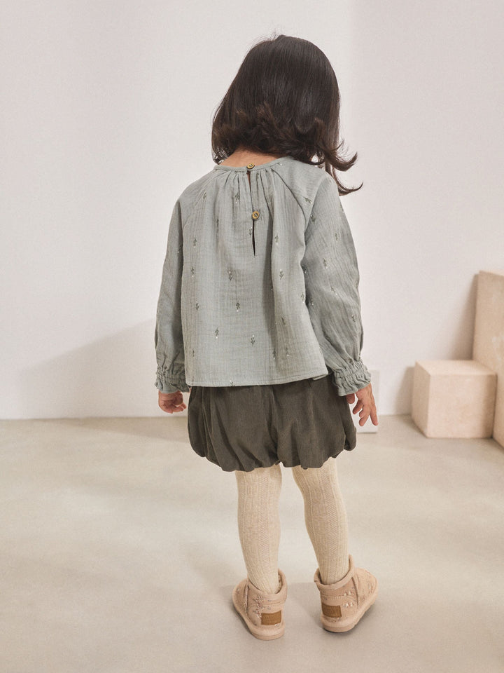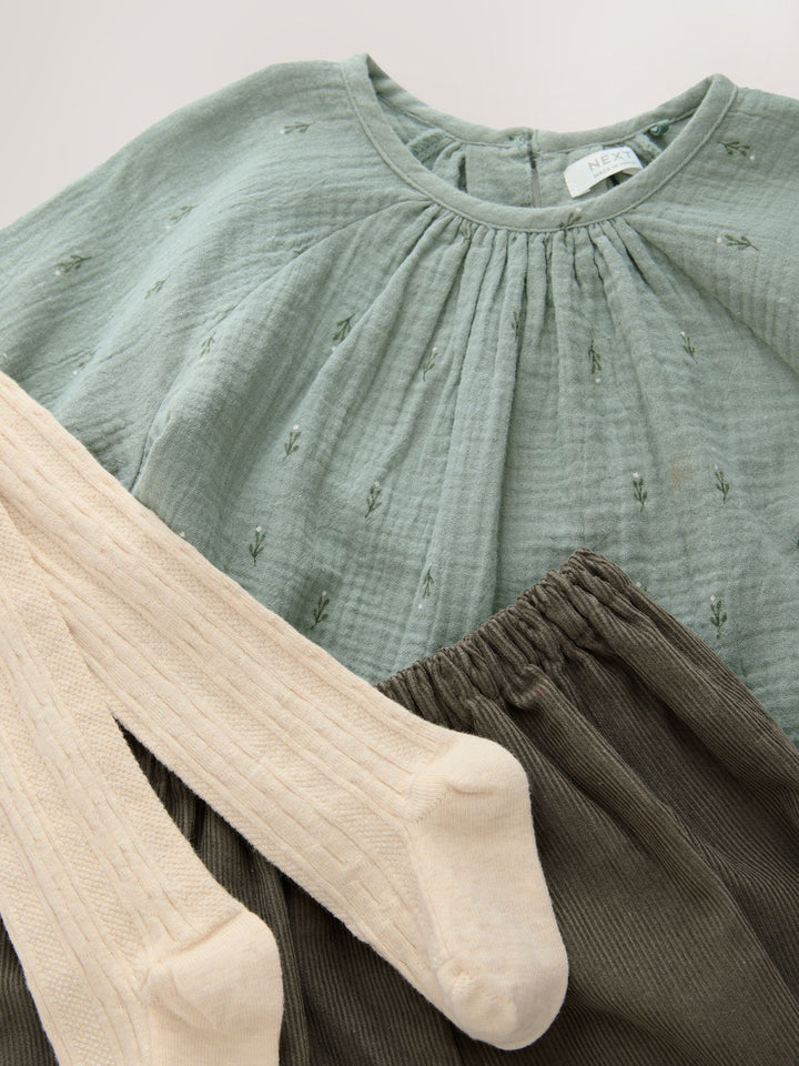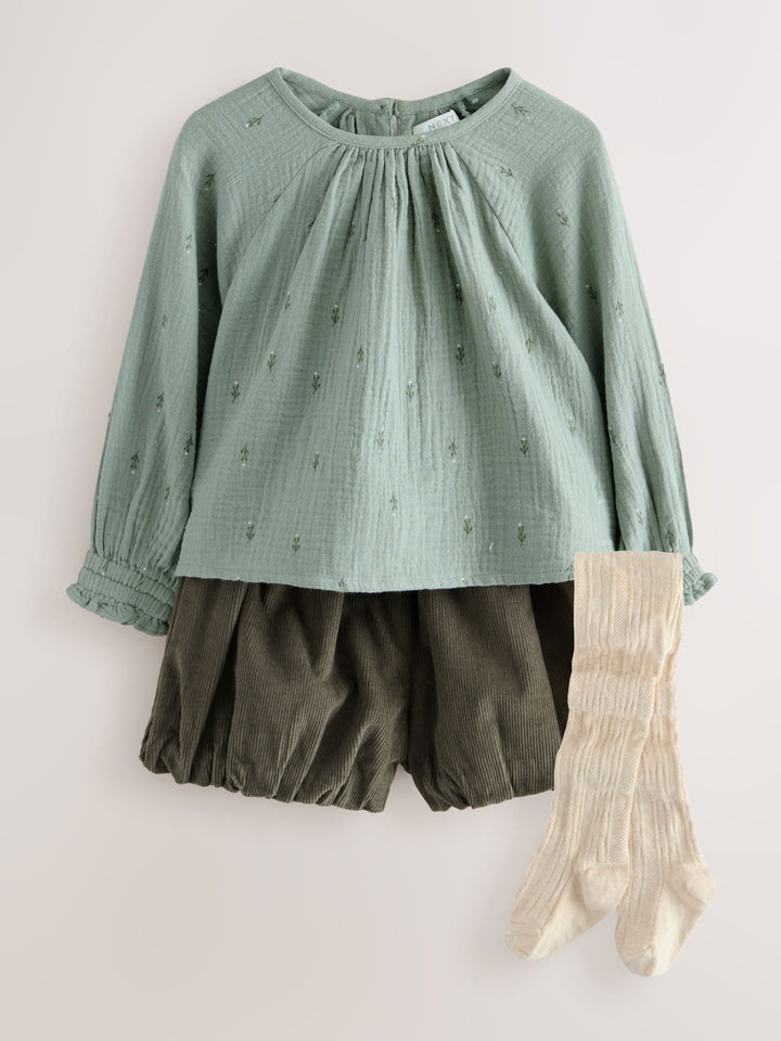 Get your little one ready for a fun day out with this three-piece set in green. The long-sleeved blouse features a charming round neckline, while the shorts have a playful puffball shape and a fully elasticated waist for a comfortable fit. A perfect outfit for a fun day out. 3-piece set Fully-elasticated waist Long-sleeved Round neck Puffball shorts Blouse 100% Cotton. Shorts Main 100% Cotton. Lining 100% Cotton. Tights 76% Cotton, 22% Nylon, 2% Elastane. Country of Origin: India
