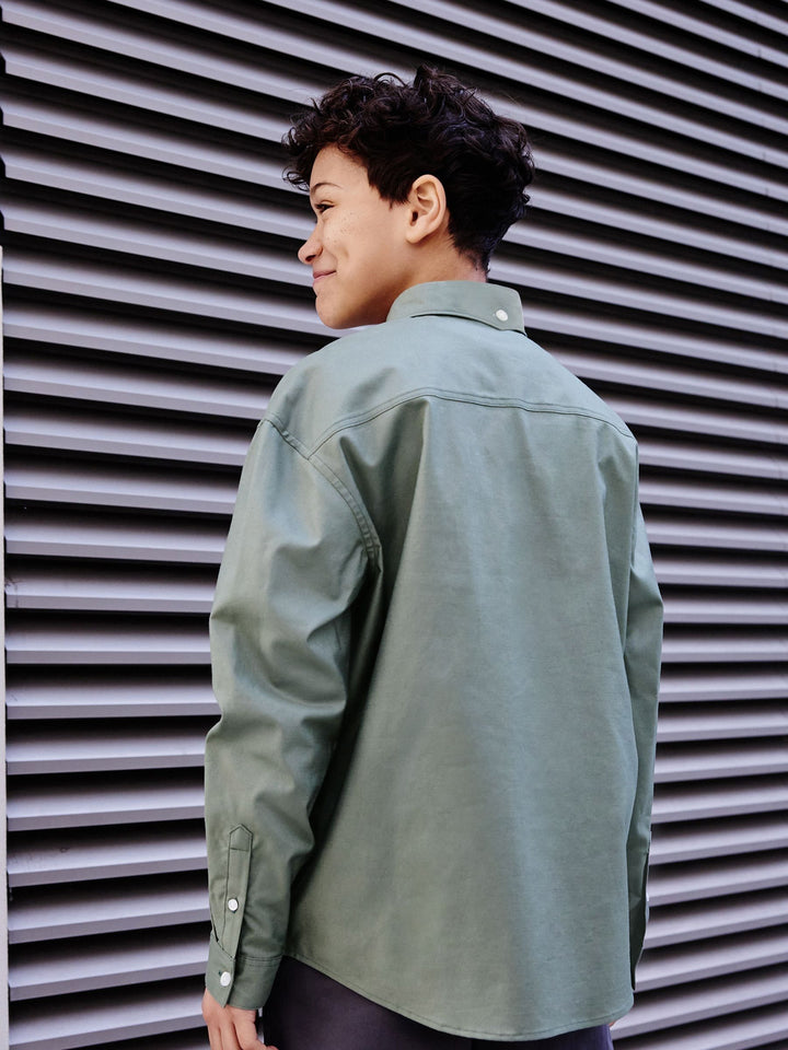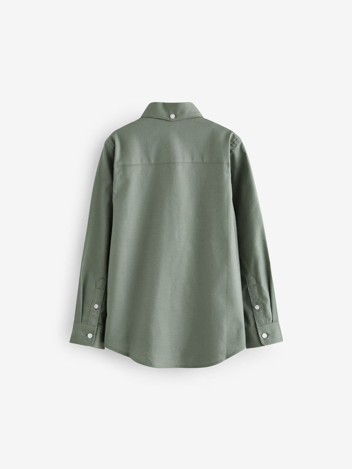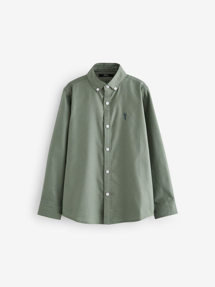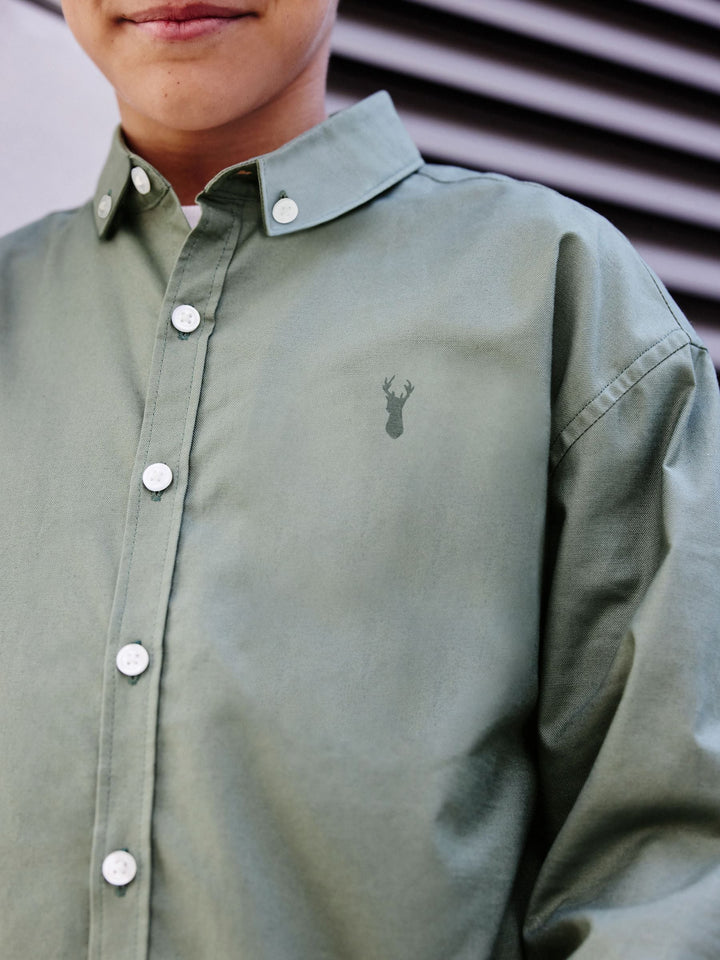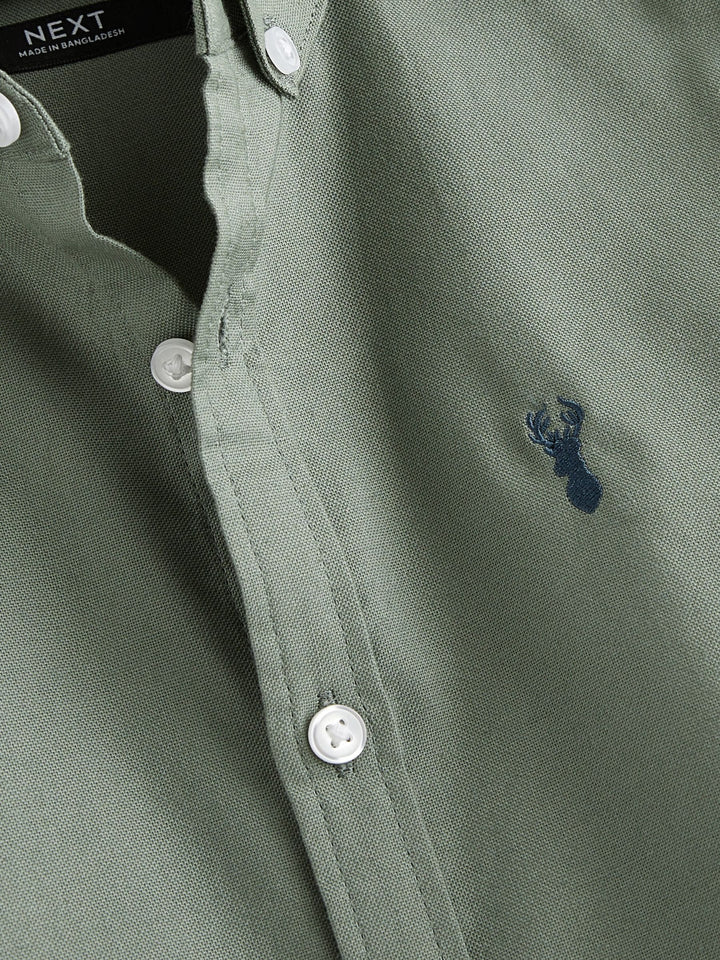 Taking inspiration from our menswear collection, this shirt in green is made with a cotton-rich construction and elastane for comfort. The button-up fastening leads to a smart button-through collar finished with an embroidered chest logo. Long sleeve Slight stretch Button-up fastening Button-through collar Machine washable. 98% Cotton, 2% Elastane. Country of Origin: Bangladesh