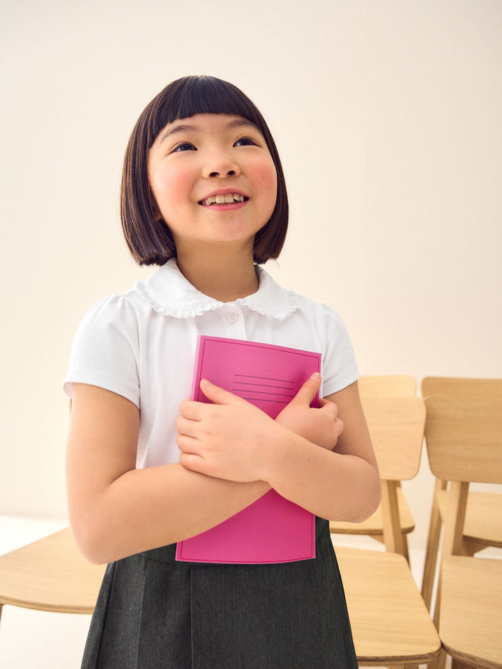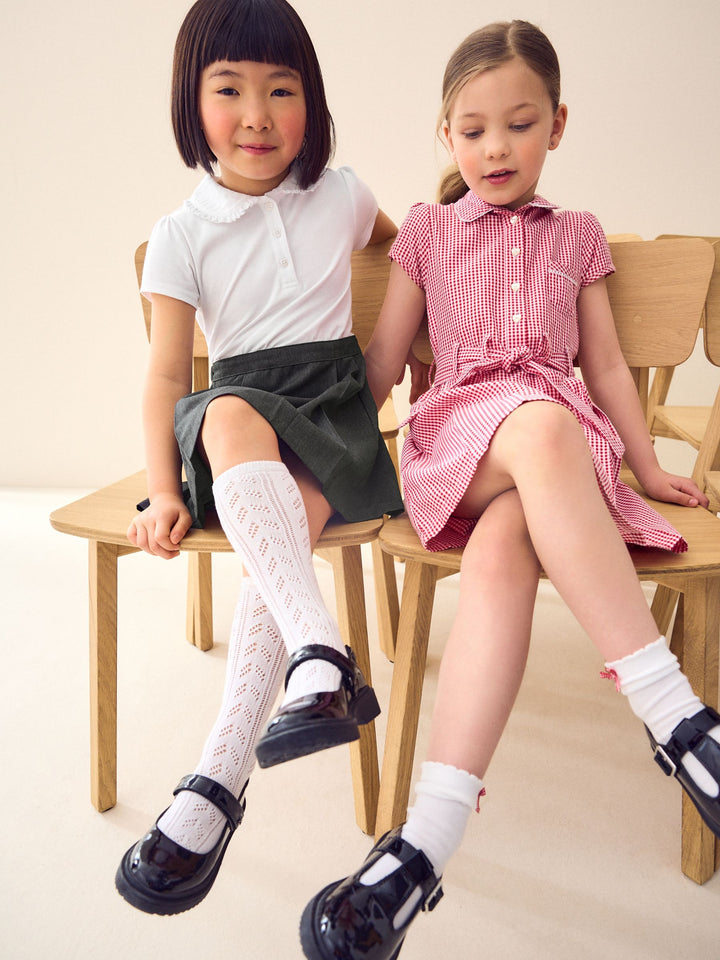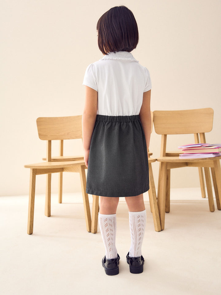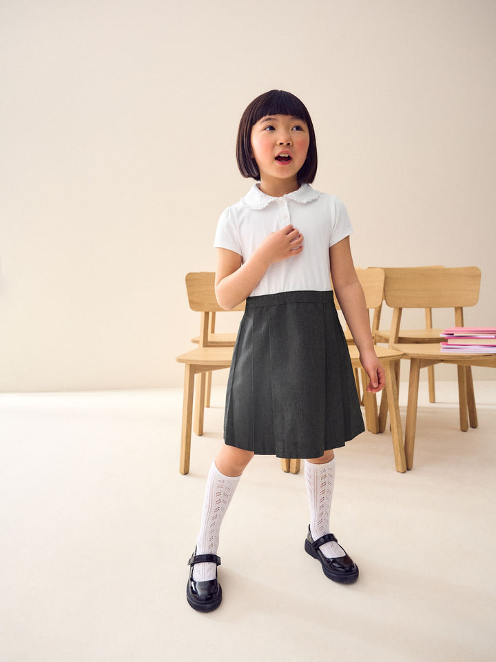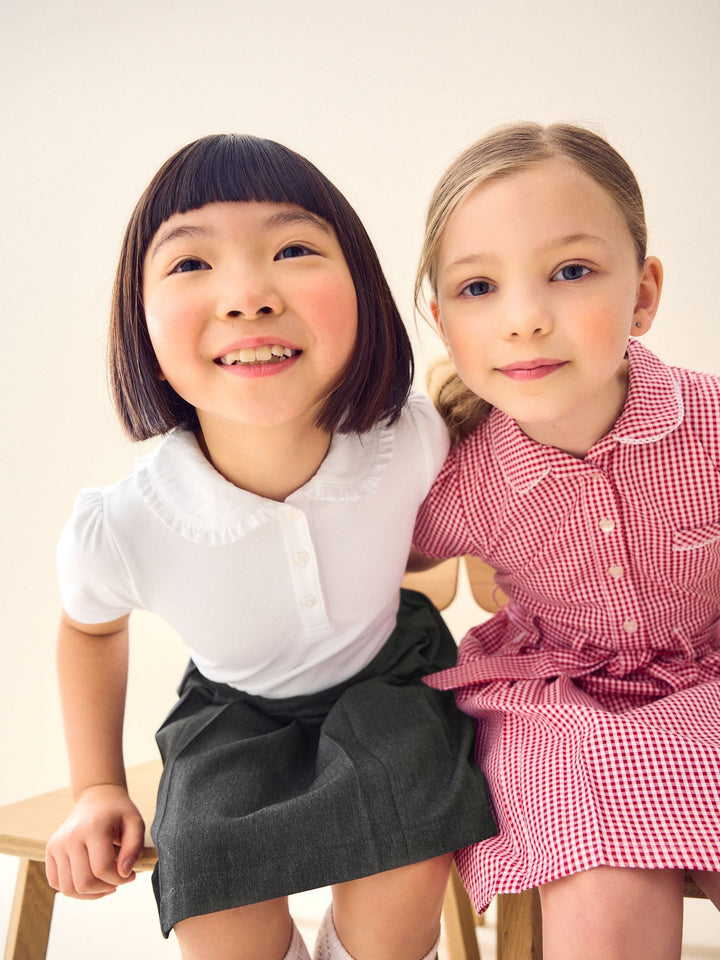 Take the fuss out of getting them ready for school with this 2-for-1 Short Sleeve School Pinafore Dress, with a Teflon finished lower half for stain resistance and an easy-iron upper half with a frilled collar. Easy Iron fabric - Handy easy-iron finish Teflon® Technology - Teflon EcoElite™ is a non-fluorinated plant-based finish that repels water and water-based stains for easy cleaning and quick drying. Visit www.teflon.com/ecoelite for more information Shirt style pinafore dress Button-top placket Machine washable. Main 100% Cotton. Skirt 65% Recycled polyester, 35% LENZING™ ECOVERO™ Viscose. Country of Origin: Sri Lanka This product is made with teflon. Teflon® is a registered trademark of DuPont.