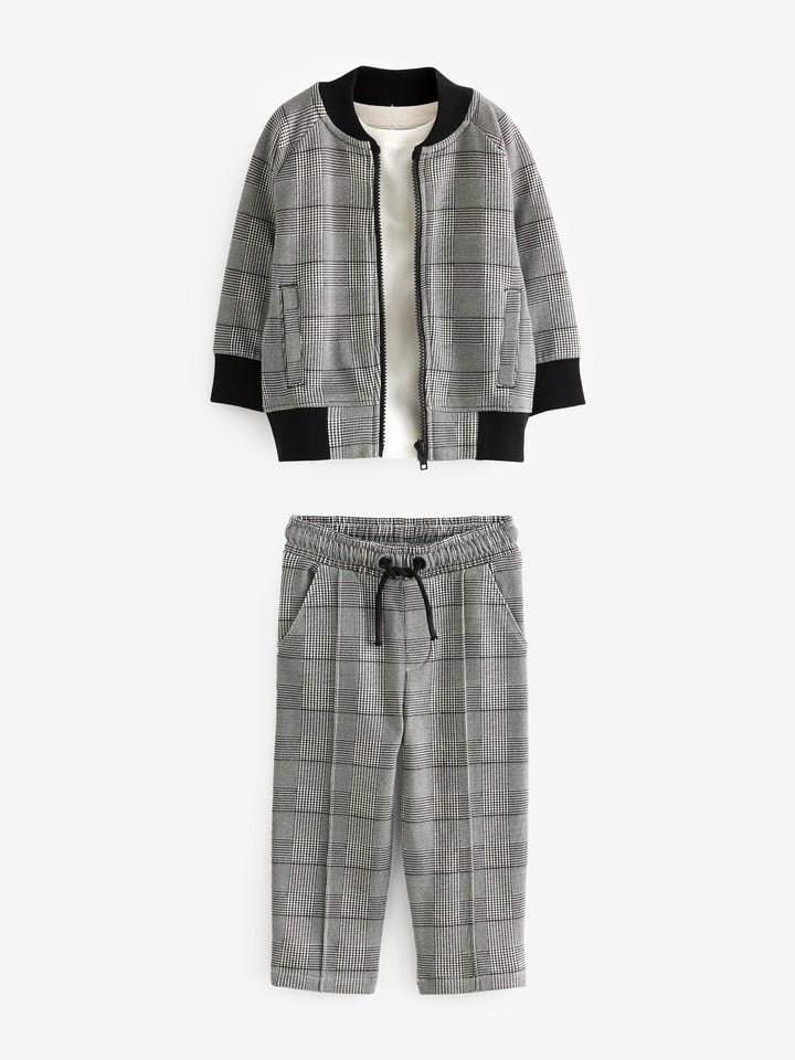 With our grey and black Three piece bomber and jogger set, we've taken the stress out of forming the perfect casual outfit, featuring a graphic print T-Shirt and a matching check-print bomber jacket and jogging bottoms. Three Piece set Graphic print T-Shirt Checked bomber jacket Checked jogging bottoms Machine washable. Jacket, Sweater and Jogger 100% Cotton. Country of Origin: Bangladesh Better Cotton - By choosing our cotton products, you're supporting our investment in Better Cotton's mission to help cotton farming communities survive and thrive while protecting and restoring the environment. This product is sourced via a system of mass balance and therefore may not contain Better Cotton. Learn more at www.next.co.uk/better-cotton