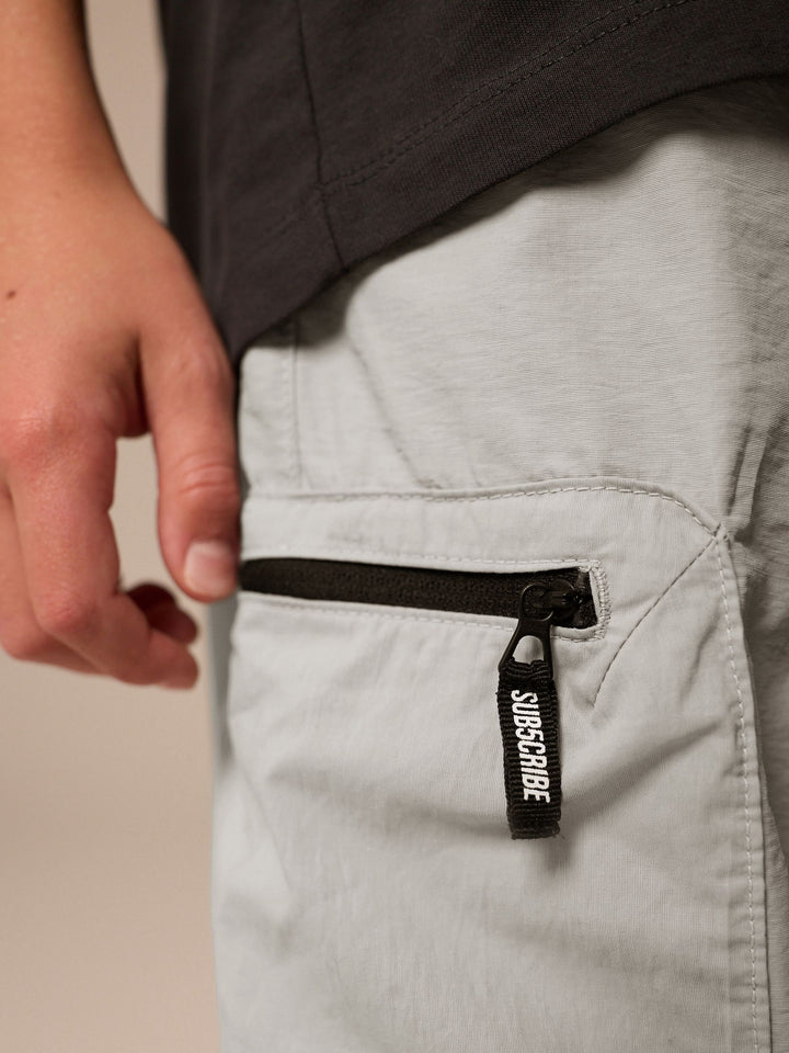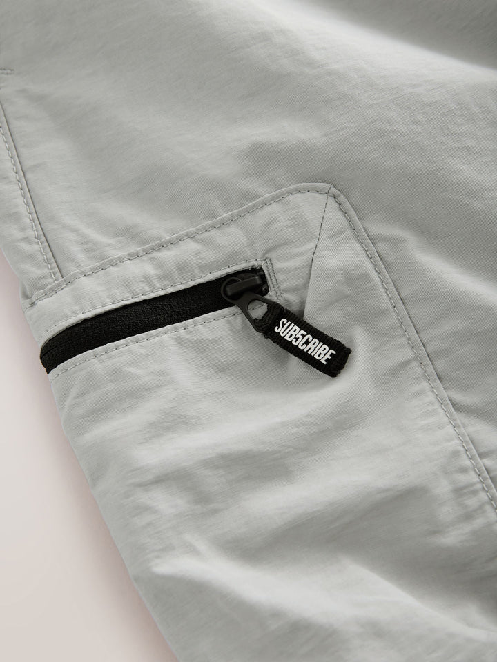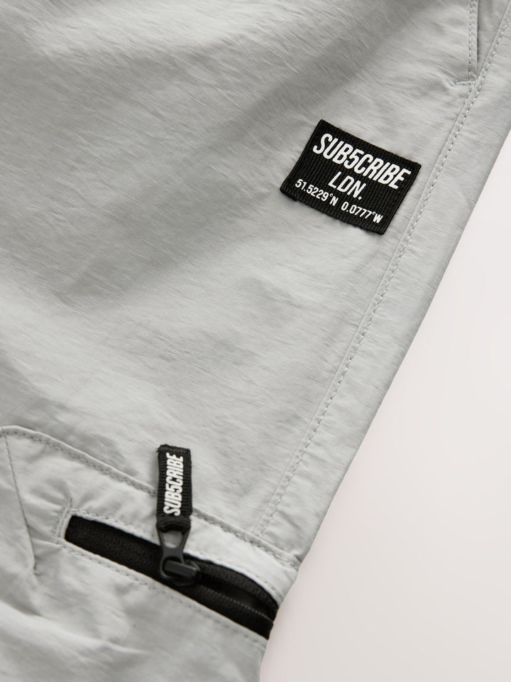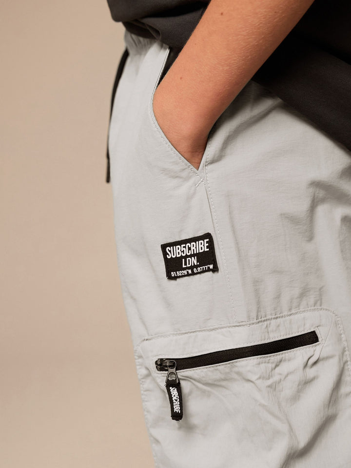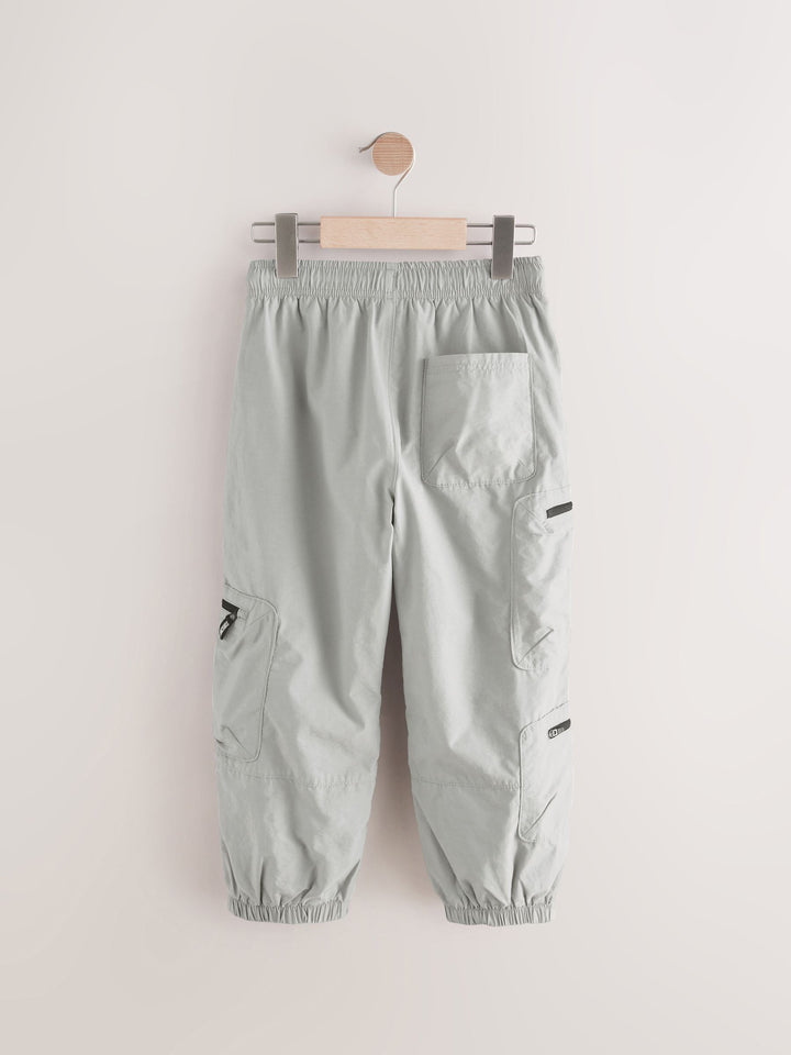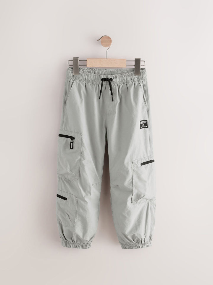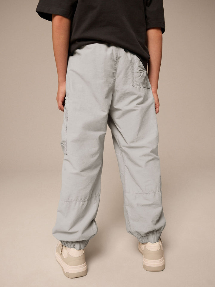 Great for everyday wear, these trendy grey trousers have a modern utility-inspired design and a wide leg, featuring an elasticated waistband for pull-on wear, cuffed ankles and multiple zip pockets, finished with rubberised branding. Wide leg Cotton-blend Pull-on elasticated waistband Zip utility pockets Rubberised branding Main 62% Cotton, 38% Nylon. Lining 100% Polyester. Country of Origin: Bangladesh