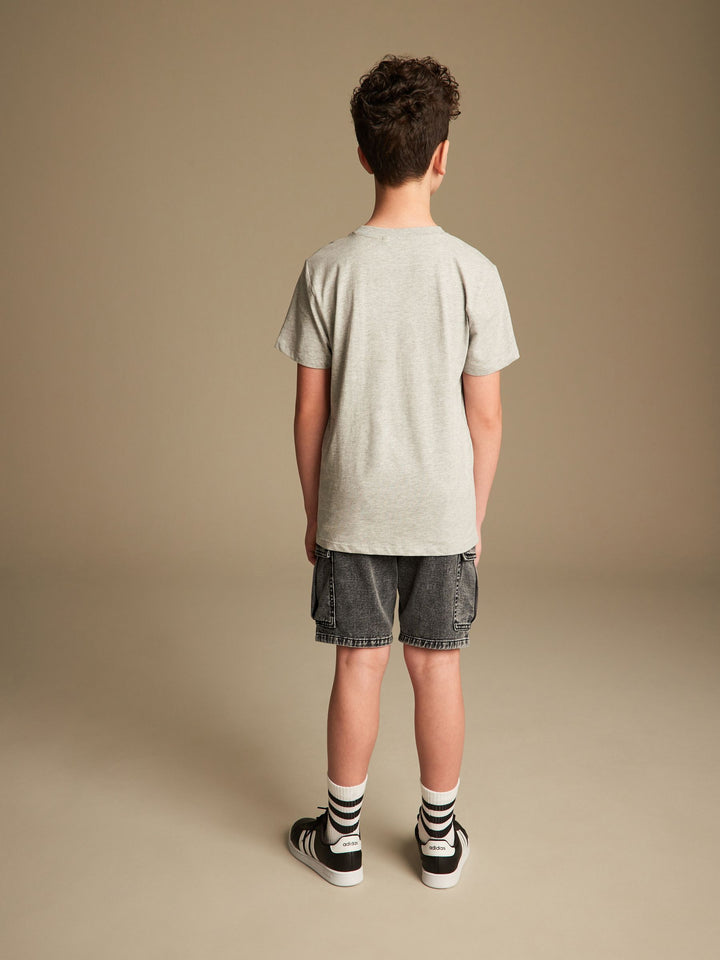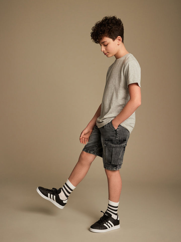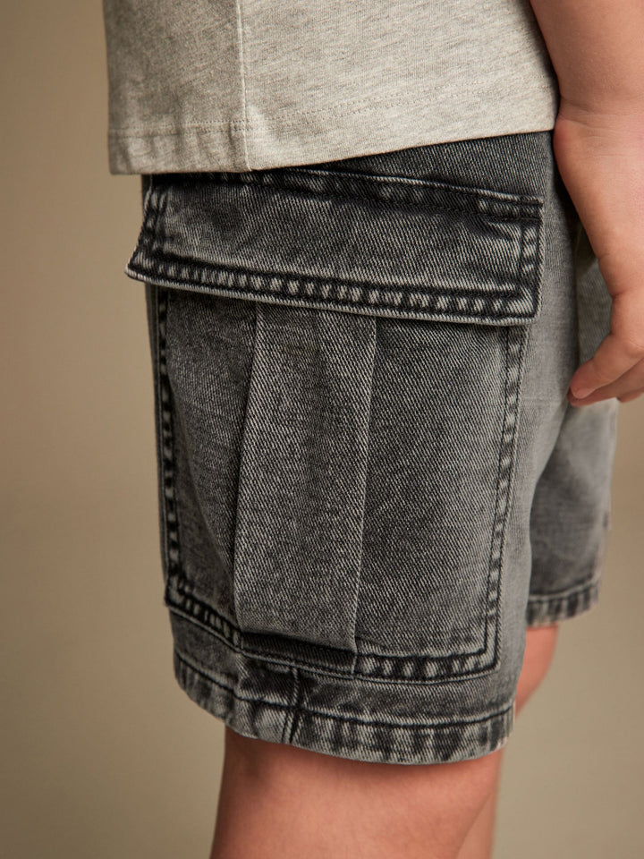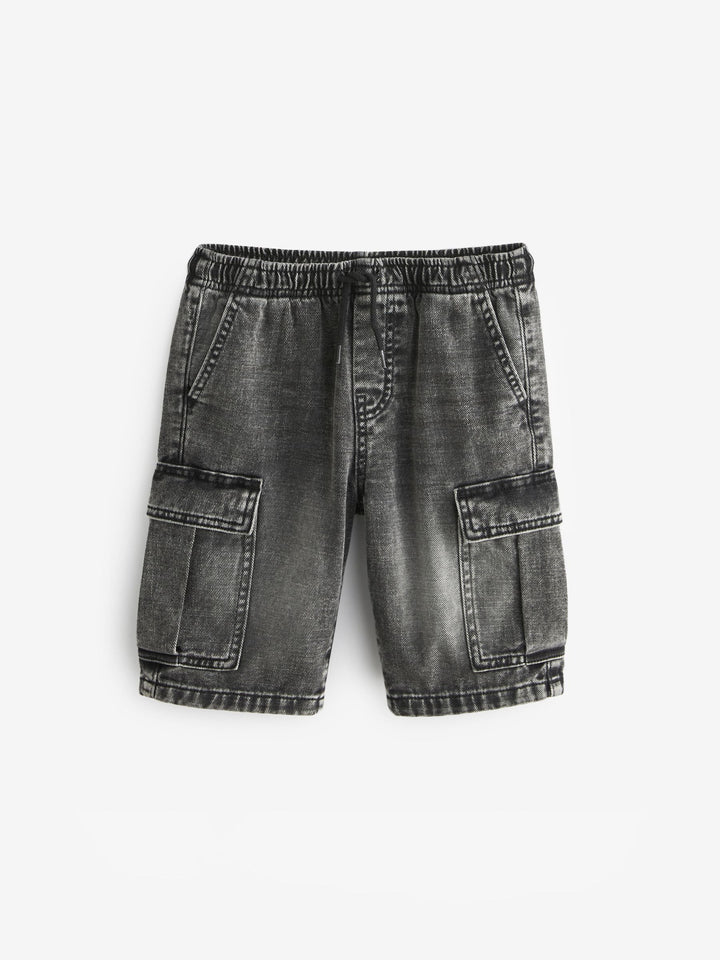Perfect for summer adventures, these pure-cotton denim grey shorts have a knee-length design with cargo pockets to the thighs, finished with an adjustable pull-on waist, dual side pockets and dual rear pockets. Regular fit Pull-on waist Cargo pockets Dual side pockets Dual rear pockets Machine washable. 100% Cotton. Country of Origin: Bangladesh