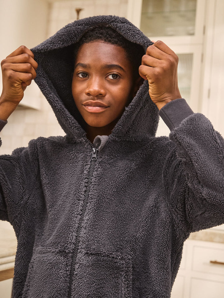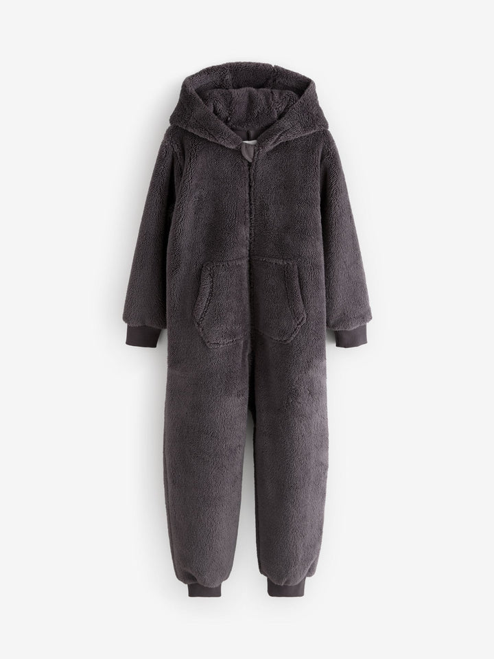 Great for gaming, relaxing or for added warmth when it comes to bed time, this soft grey fleece all-in-one features a full zip fastening for easy wear, a set-in hood and hand pockets, finished with ribbed hems. Regular fit Fleece fabric Full zip fastening Set-in hood Hand pockets Ribbed cuffs Machine washable. 60% Recycled polyester, 40% Polyester. Country of Origin: China Warning: Keep away from fire and flames.