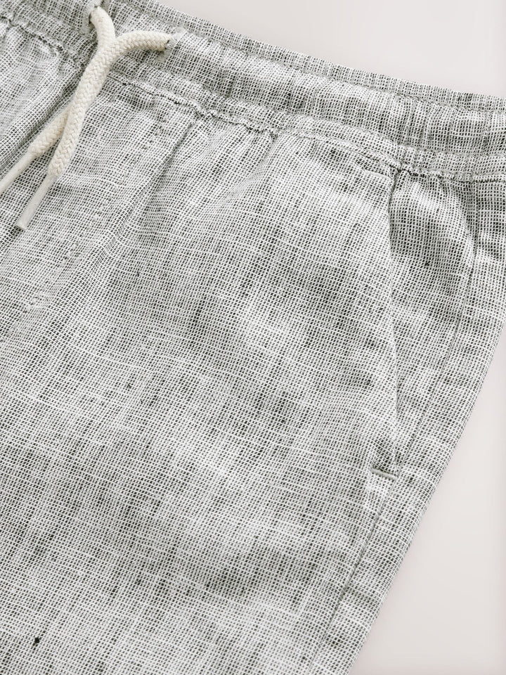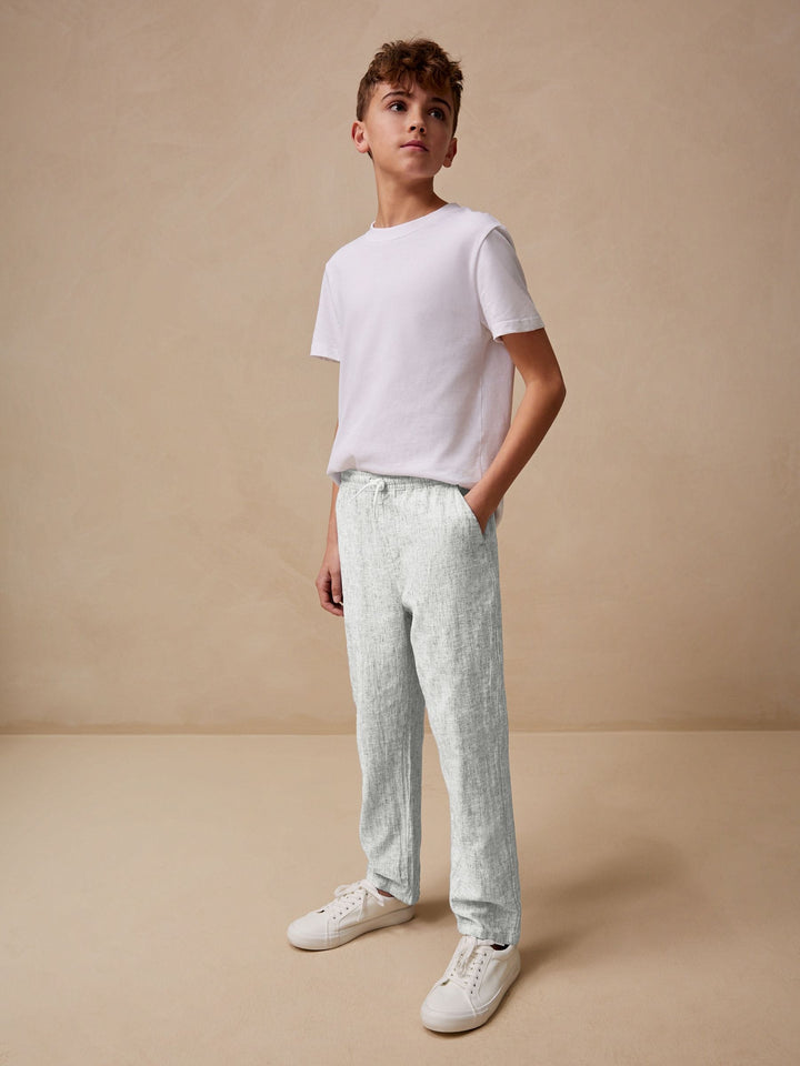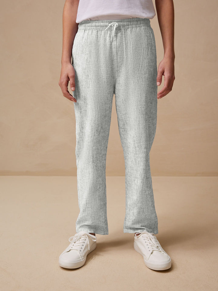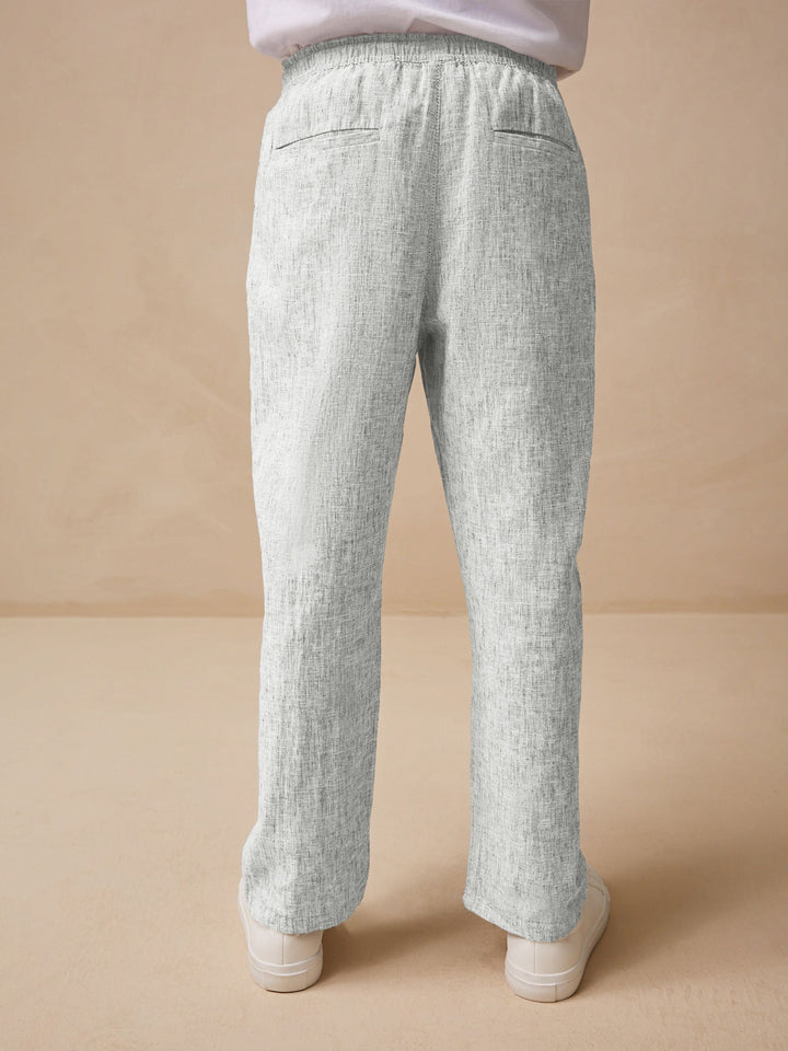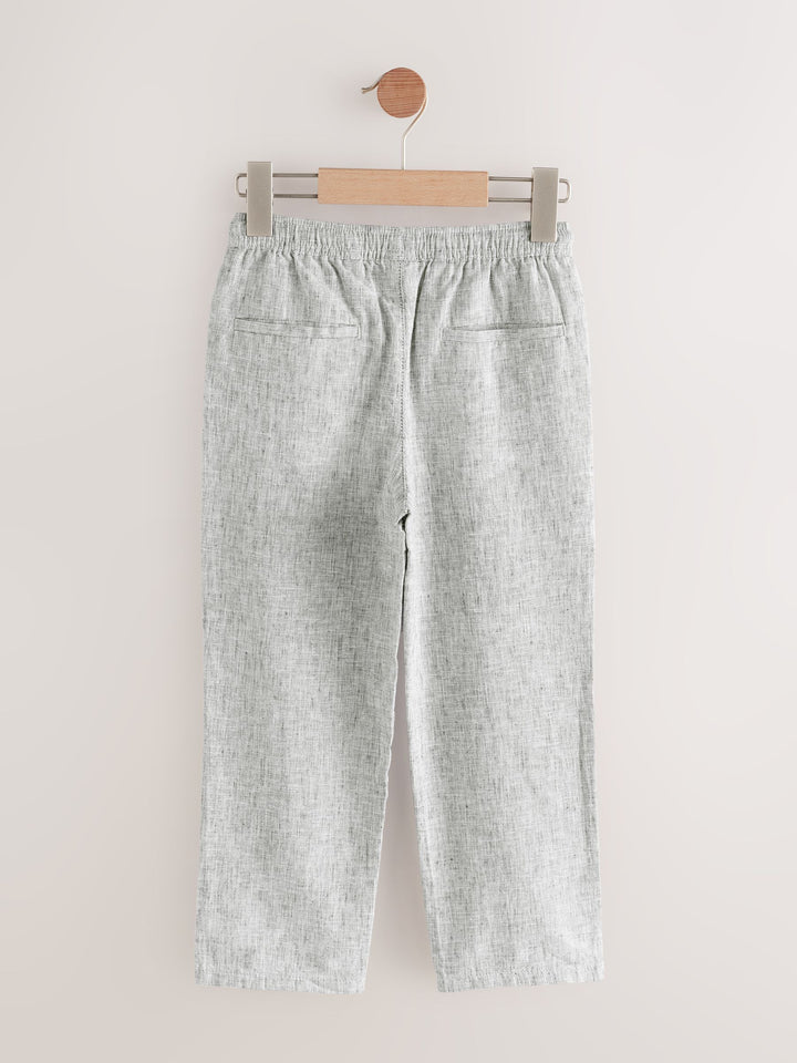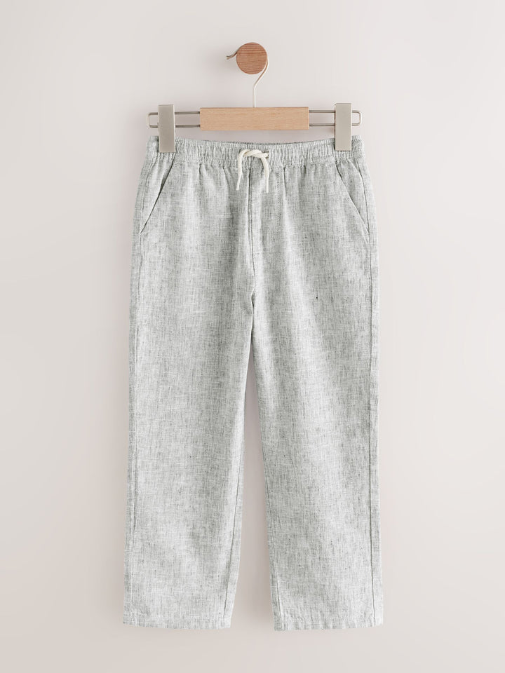 They'll love the simple style of these grey trousers, made from a comfortable airy linen and cotton blend fabric with an easy elasticated waistband and an adjustable drawstring, cut to a loose fit and finished with side and rear pockets. Loose fit Elasticated waistband Adjustable drawstring Linen and cotton blend Side and rear pockets 55% Cotton, 45% Linen. Country of Origin: Bangladesh
