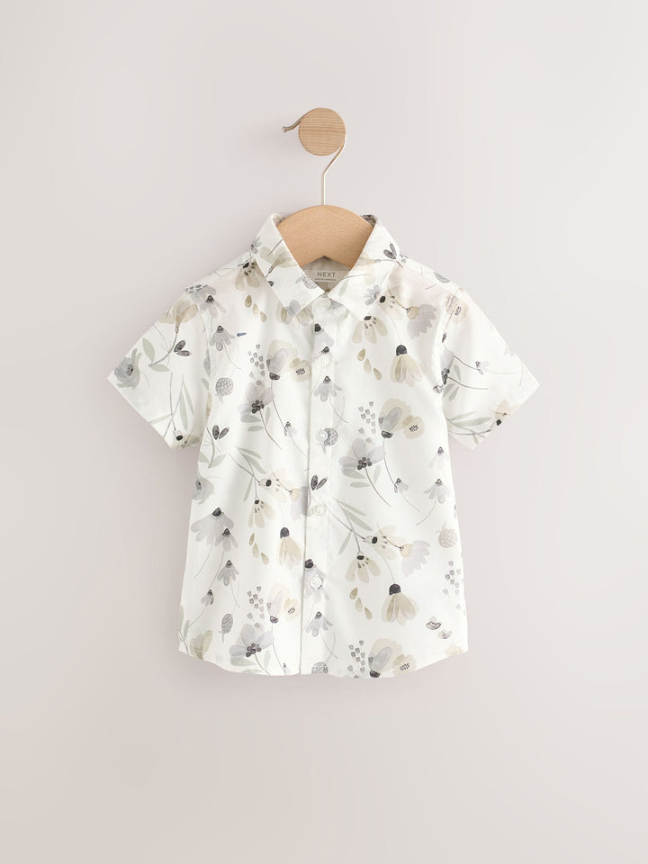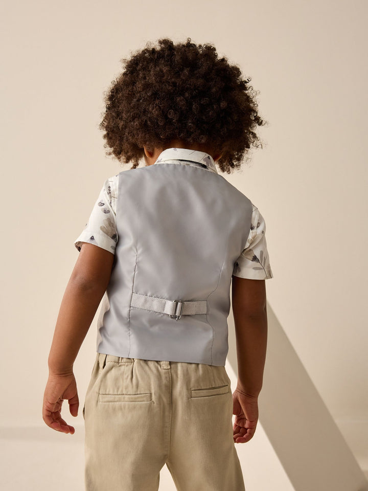 Ready for summer weddings and special events, this 3-piece set will have him looking smart, featuring a short sleeve shirt with an all-over floral print and a button-down fastening, a grey waistcoat with a button-down fastening and a touch-fastened bowtie. 3-piece set Short sleeve shirt 100% cotton Floral print Grey waistcoat Button-down fastening Touch-fastened bowtie Waistcoat Main 64% Polyester, 34% Viscose, 2% Elastane. Lining 100% Polyester. Shirt 100% Cotton. Bow Tie 100% Polyester. Country of Origin: Cambodia
