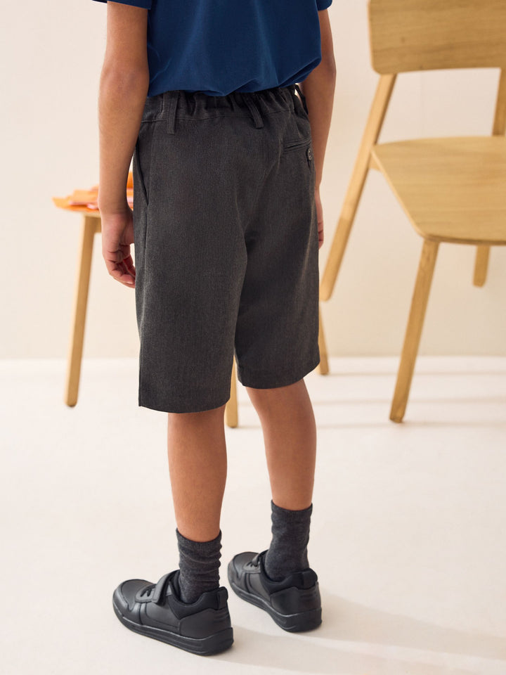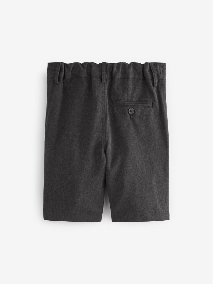 Keep him smart and stylish with these easy-to-wear grey school shorts. The zip fly front comes with hook and bar fastening and the elasticated waist ensures the perfect fit. Complete with an easy iron finish, these really are the perfect pair for his summer uniform.Key features Easy Iron Fabric - Handy easy-iron finish Teflon® Technology - a treatment that repels water and water-based stains for easy cleaning and quick drying Machine washable Elasticated back waistband Flat front Pull-on waist option available Machine washable. 65% Recycled polyester, 35% LENZING™ ECOVERO™ Viscose. Country of Origin: Bangladesh This product is made with teflon. Teflon® is a registered trademark of DuPont.